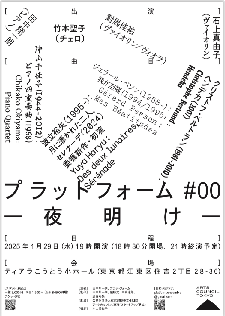 これから現代音楽家が向き合わねばならない課題は「調性」である、というのが筆者の持論である。くだくだしくは述べないが、クセナキスと吉松隆を架橋するような姿勢、またはクセナキスと吉松隆を共に批判(critique)するような姿勢こそが音楽の未来を作ると本気で信じている。もう随分と昔になってしまったがこんな記事を書いたこともあるし、2024年にはこんな評も書いた。この2024年の評に登場した波立裕矢が制作陣として名を連ねる「プラットフォーム」の旗揚げ公演ならば行かざるべからず、だったのだが、やはり波立は本物であった。