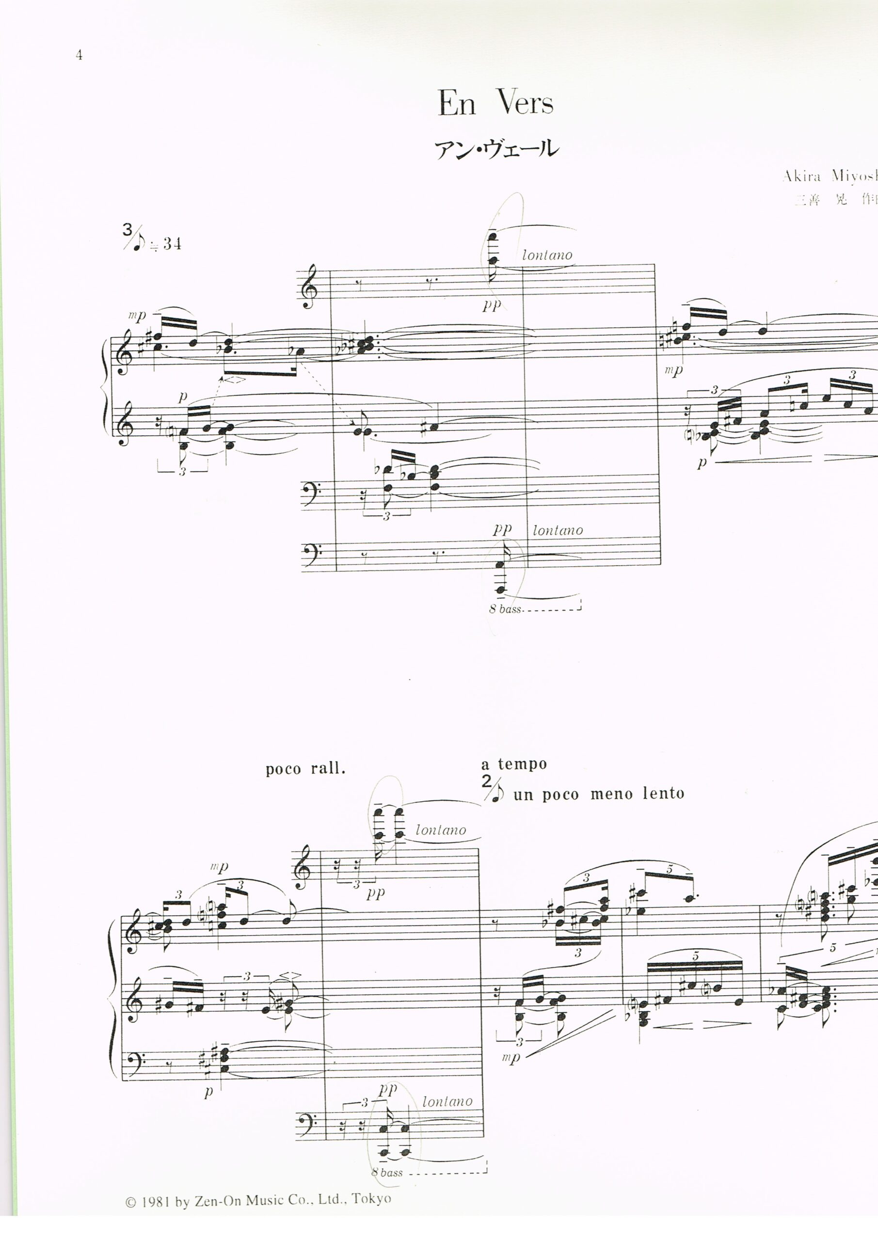 付け加えるなら、彼の天性の手駒と言うべきピアノ曲は『ピアノ・ソナタ』(1958)が第1作だが、「僕の指はピアノ育ち」「喧嘩して噛み付いたりした幼友達」であるピアノへの親愛は、ほぼ20年の歳月をかけて完成した『Miyoshi ピアノ・メソード』(1997)に明らかだ。そうしてこの20年こそが、器楽におけるカダンス、韻律、声を探った作業であったことも指摘しておこう。生徒の弾く単音旋律の下で先生が弾くハーモニー進行の独特に(読み聞かせの「間」、声音で世界が変わったように)、それはありありと示されている。『EN VERS』はその道程にあって生み出された作品なのだ。一方、4歳から学んだ平井康三郎のもと、ハーフ・ヴァイオリンでザイーツのコンツェルトなどを弾いていた頃、ヴィブラートを教えられ、その響きを「人の声」に似ている、と感受したその感性もまた、「声」であった。