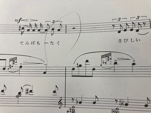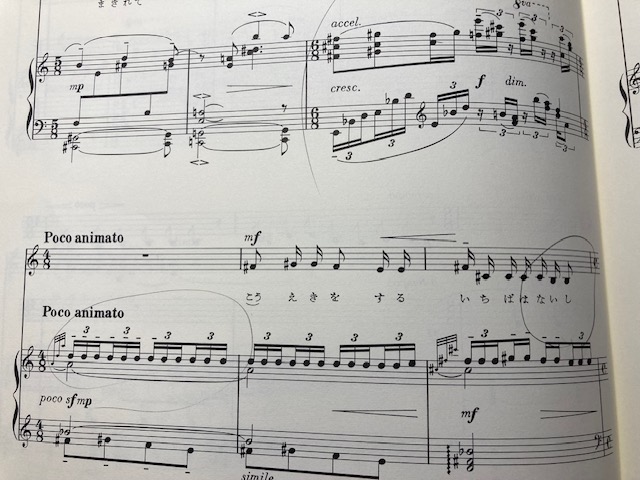 連載第1回で《寄生蟹のうた》のスコアを見たが、《沿海地方》での上記詩句部分は以下。冒頭、Lentのゆったりしたピアノの開始に、低音で呟き始める「うまやらくだの」の2行ののち、accel.でピアノが高音三連和音をfでキラキラ鳴らすのを受け、Poco animato 、mfで「こうえきするいちばはないし」が入る。際立つのはピアノの3連音符同音連打で、詩句はその刻みの上を隣接音高に僅かの段差をつけつつ朗詠されると言えば良いか。朔太郎いうところの「ないし」は16分音符で細かく歌われ(語られ)、ピアノがオクターブ上の音で3連符と16分音符、16分音符と3連符を組み合わせる形でこれに沿う。「出来はしない」は八分音符でゆったり、「しない」にはアクセント記号がつき末尾 rit.の指示がある。ピアノはほぼ並行して動き、詩句を支える。「なく」は前句「てんぽも〜」が「なく」に3連符スラーで繋がれ、「なく」を際立たせる。朔太郎の「朗吟」(後述)そのままと言えよう。