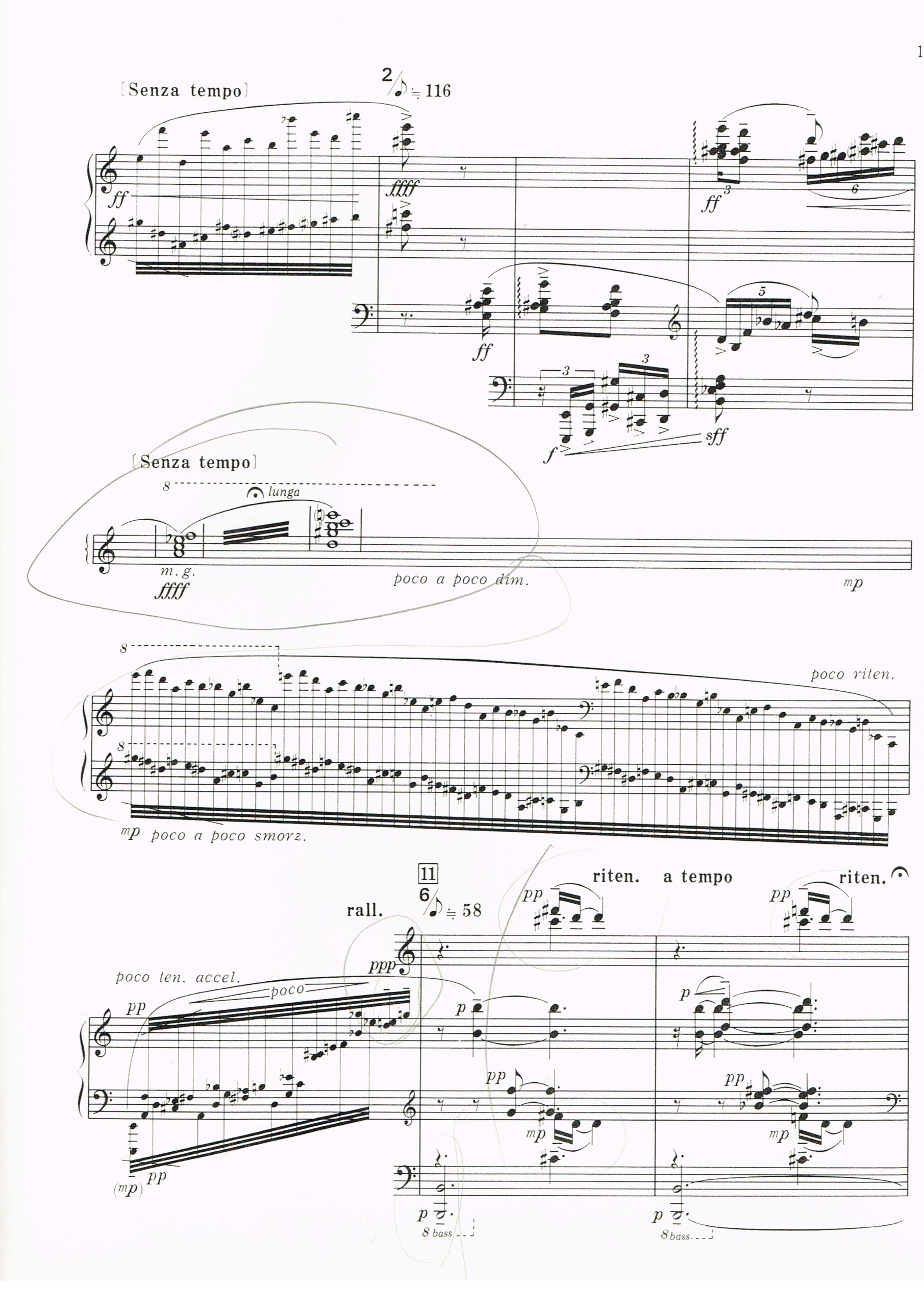 スコアを見れば、長短3度からなる韻が冒頭から示され、A〜Aの間を3度の音型が文様を描きながら繰り返し韻を踏んでゆく足取りが読み取れる。筆者はスコアを見ずに聴いていて、ふと日本の昔話の語り口を思い出した。何がどうとは言い難いのだが、長短3度の下降形とそれをうべなう低音高音のユニゾンは、むかしむかし、という語調に似て、物語の流れの基調として響き続けているように聴こえる。ドーンドーンと梵鐘のように鳴らされる深いユニゾンは教会の鐘のようでもある。そのステップごとに少しずつ風景が変化してゆき、物語のテーマ、例えば『桃太郎』で桃が流れてくる、そんなシーンから話がアッチェルランドしてゆく語りの定型そのままに、音となっているのだ。いわゆる序破急、詳細には立ち入らないが、重音での並行進行や単音の置き方、分割音形での時間感覚の調整やアルペッジョによるクリスタルな彩りなどの背後に鳴っているのは、三善独自の「カダンス」そのものではないか。非常にシンプルな操作でありながら、クラスターやオクターブでのアクセントを伴う鋭い刻みなどで局面を大きく変化させる、そのドラマトゥルギーが日本の「語りもの」に近い、という印象を受ける。そうして、実はこの語りは、言語の相違や風土を超えた人類の普遍「民話」のルール(韻律)に基づき、だからティボーデが感受し得たのだ、と気づく。筆者はそこにありありと、三善の枕元での母の読み聞かせを想起したのであった。