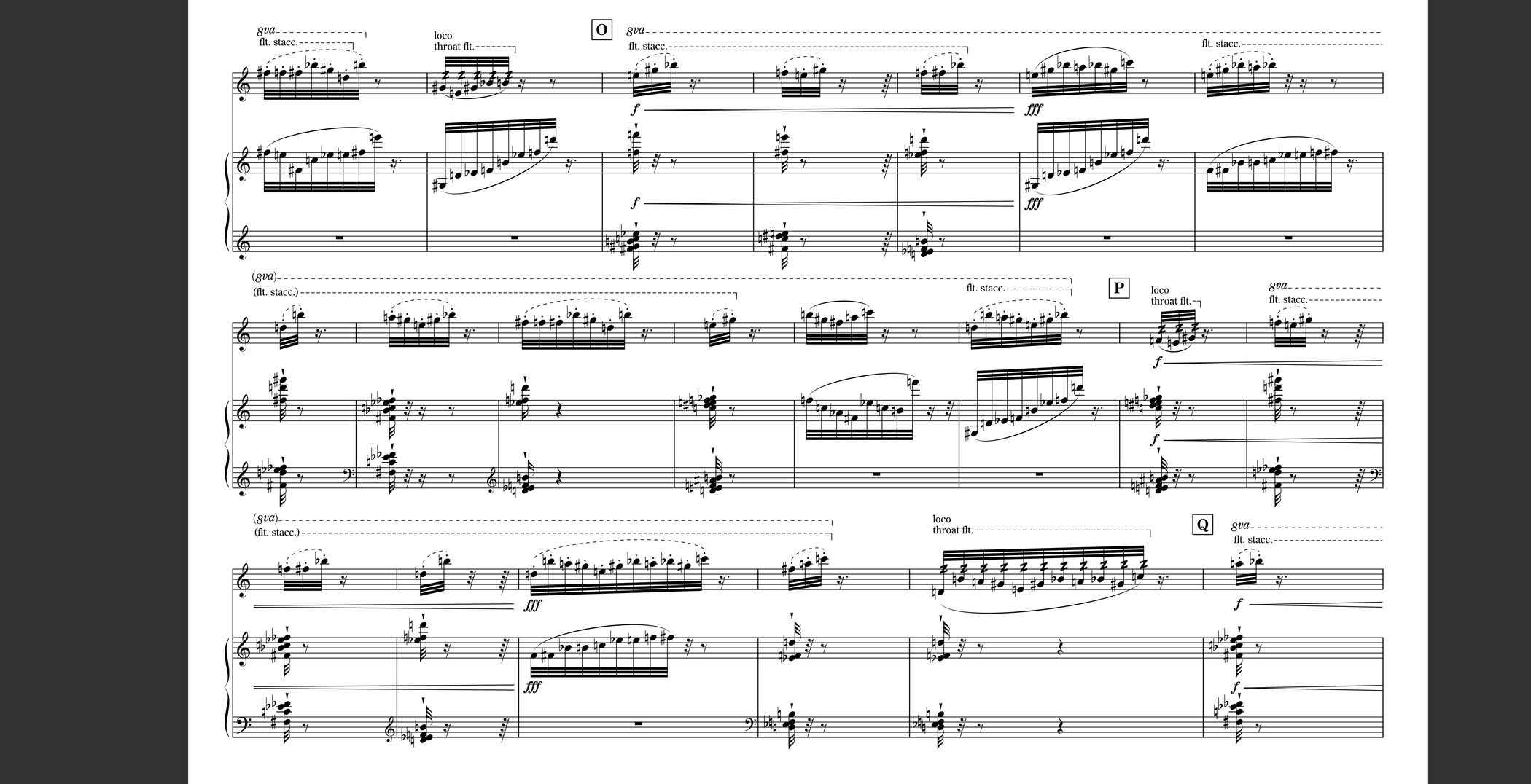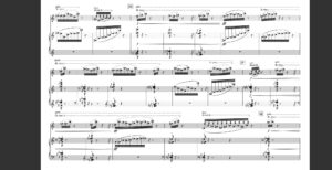 2012年の作品です。演奏者と楽器研究を重ねて創作することは多くの作曲家が行うことかと思いますが、私にとって本格的にその手順を踏んで創作した初めての作品となります。初演を務めてくださった木埜下大祐さんと、カリン・レヴァインの「フルートのための現代音楽、演奏技術と記譜」(ベーレンライター社)を参考にしながらディスカッションを重ね、実演していただいたセッションの録音を繰り返し聴きつつ創作を進めました。当初はフルート独奏曲として構成していましたが、どのように考えても納得のいく終止線を引けそうにない。何か楽器を足したい。楽器の選択において特定のこだわりはありませんでしたが、初演の環境から最も適していたのがピアノであったため、結果としてフルートとピアノの二重奏曲となりました。フルートの超絶技巧が駆使された楽曲として差し支えのない内容の作品だと思います。