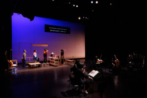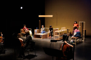 『リビングルーム』はその延長線上に位置づけられるが、今回はロンドン在住の現代音楽作曲家・藤倉大との初コラボレーションである。コロナ禍の中、リモートによるやりとりを含む創作過程を経て完成した音楽は、ヴァイオリン2、ヴィオラ1,チェロ1、ファゴット/コントラファゴット、クラリネット/バスクラリネット、チェレスタからなる7名編成の室内アンサンブルによって演奏された。しかもその7名は舞台前面に広がって着席し、6名の俳優は、舞台下手奥のリビングルームをイメージさせる空間にいる。そして、この配置のまま、上演は開始される。
