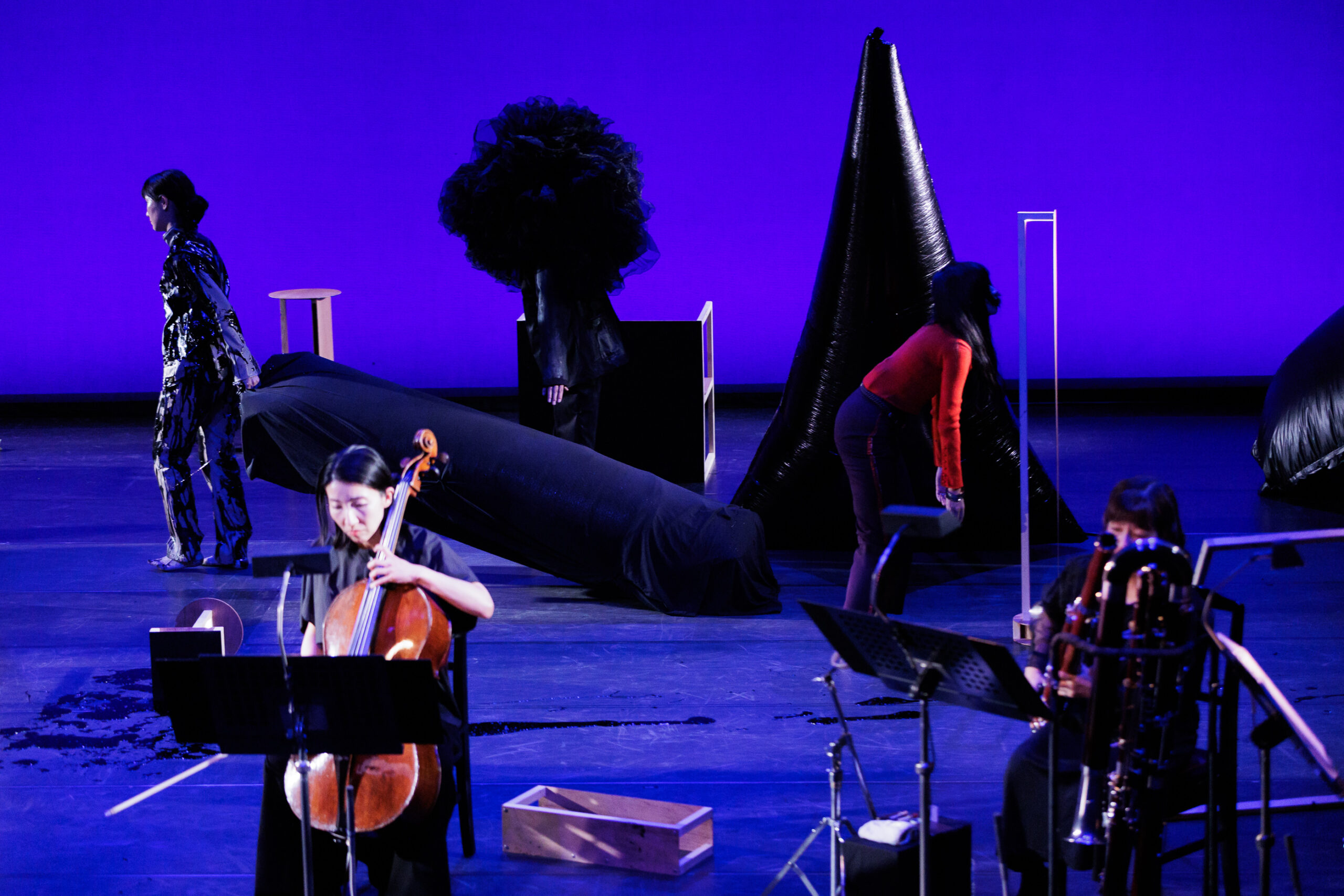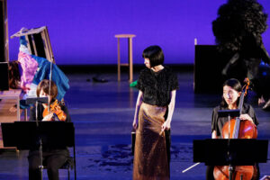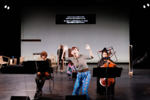 物語は、家父長的な〈男主人〉[ii]に支配された女性たちの〈家族〉が、〈リビングルーム=家〉から解き放たれていくという比較的シンプルなもの。ただし得体の知れない〈気配〉(俳優が演じる)が出現し、舞台空間を浸食して装置の具体性を解体していく。その過程で女性たちは、時として演奏家たちの間をぬって舞台前方に進出する。結果、俳優と演奏家が共存するかのような〈曖昧な空間〉が生起し、〈リビングルーム〉のみならず、人物たちの多くもまた、名指すのが難しい何かへと〈メタモルフォーゼ=変容〉してしまう。世界の終わり? 近代家族の終焉? はたまた、現実と虚構の境界崩壊?