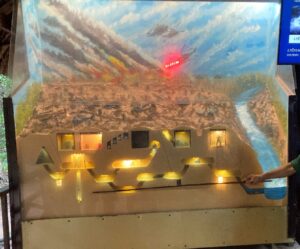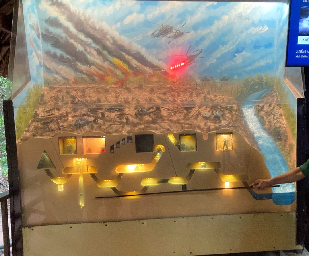 映画の舞台は、南部ベトナムのビンアンドン社というところにあるクチトンネルだ。クチトンネルは現在、ホーチミン市から日帰りで行ける観光地として有名なので、この名前を耳にしたことがある人もいるかもしれない。南ベトナム解放民族戦線側のゲリラ部隊が生活したトンネルで、最終的には全長200キロメートル以上にも及んだという。何層にもなる構造で、かがんだり這ったりしないと前に進めない小さな通路がいくつもの「部屋」をつないでいる。写真は私が昨年観光で訪れたときに撮影した、クチトンネルの構造を紹介する展示である。