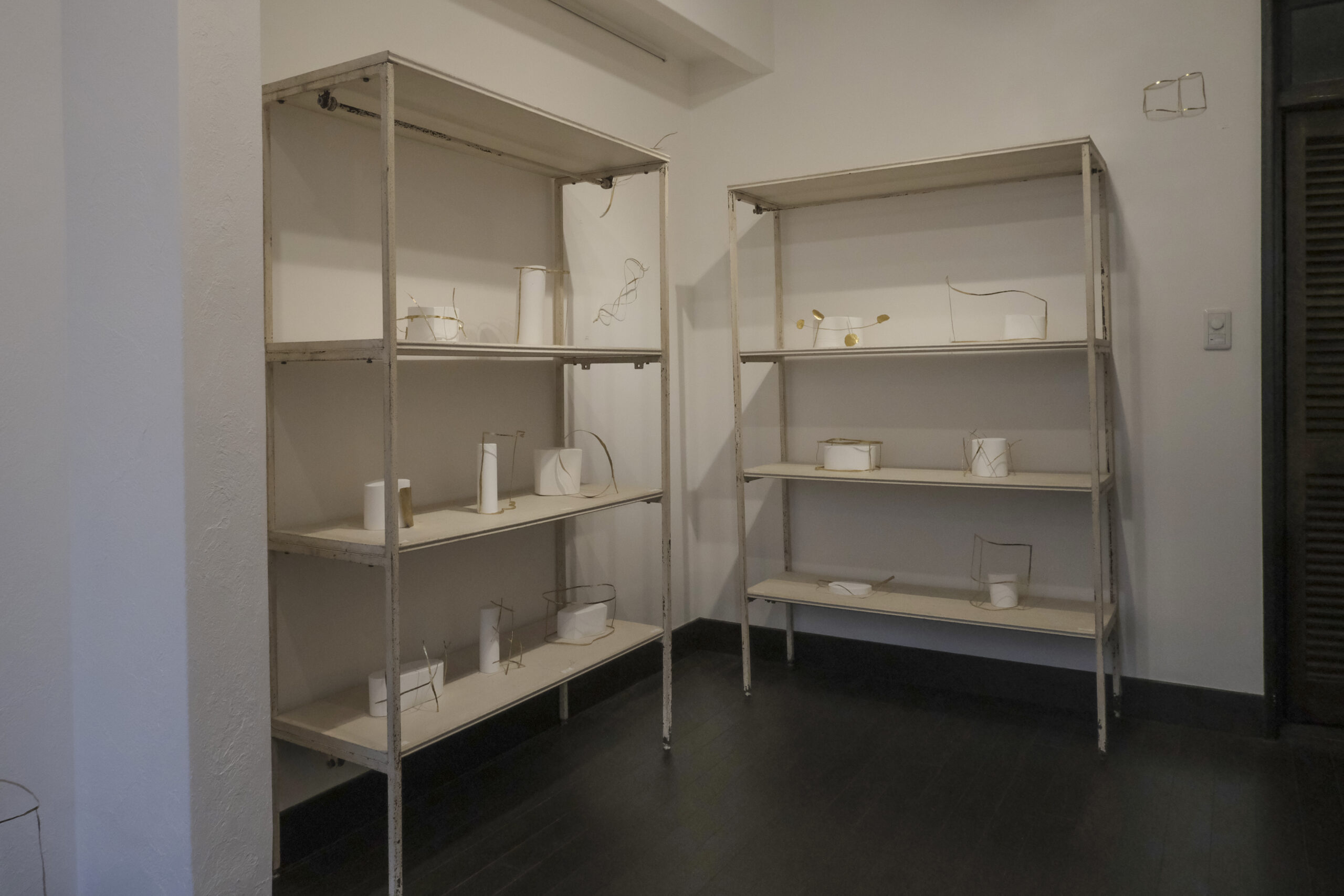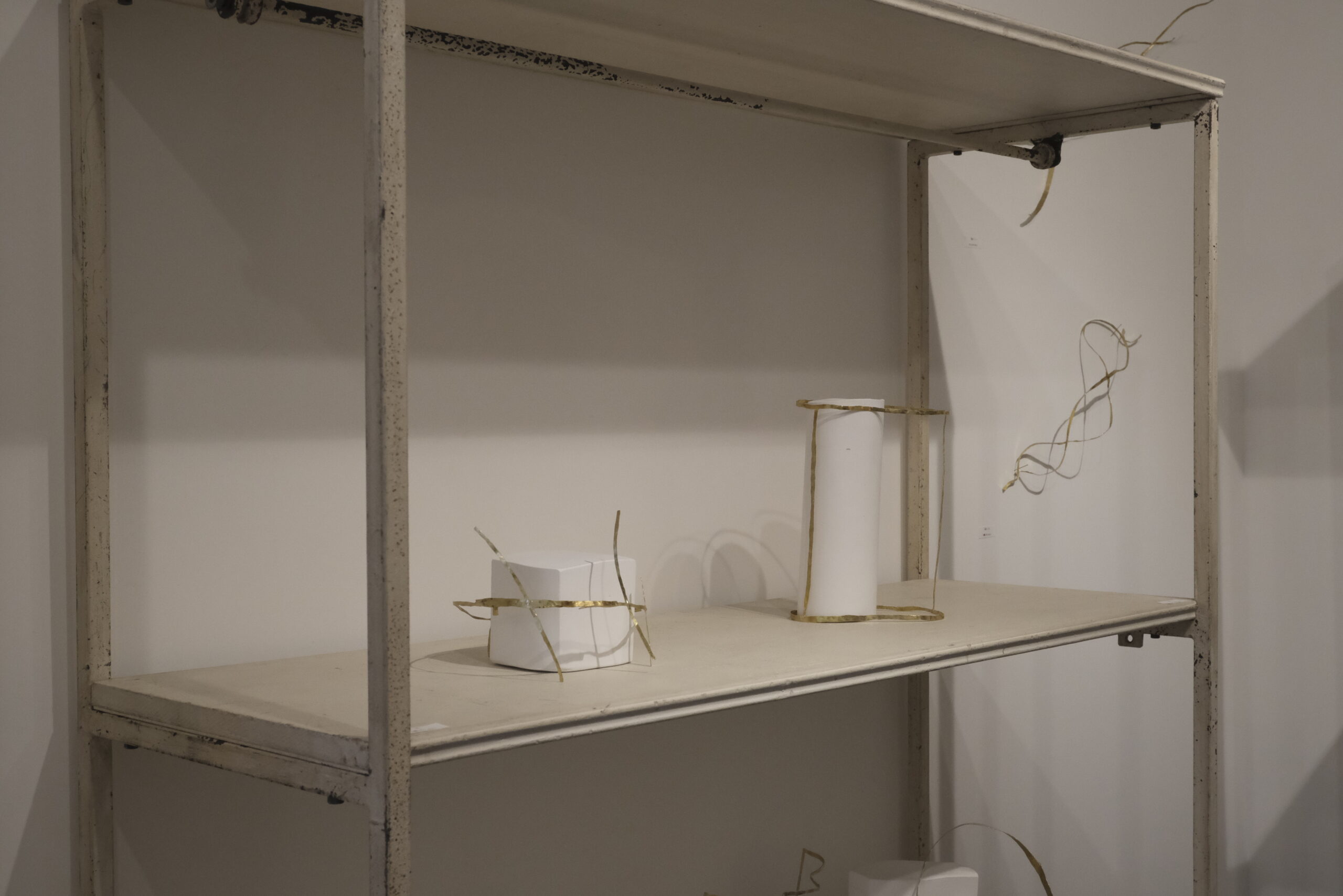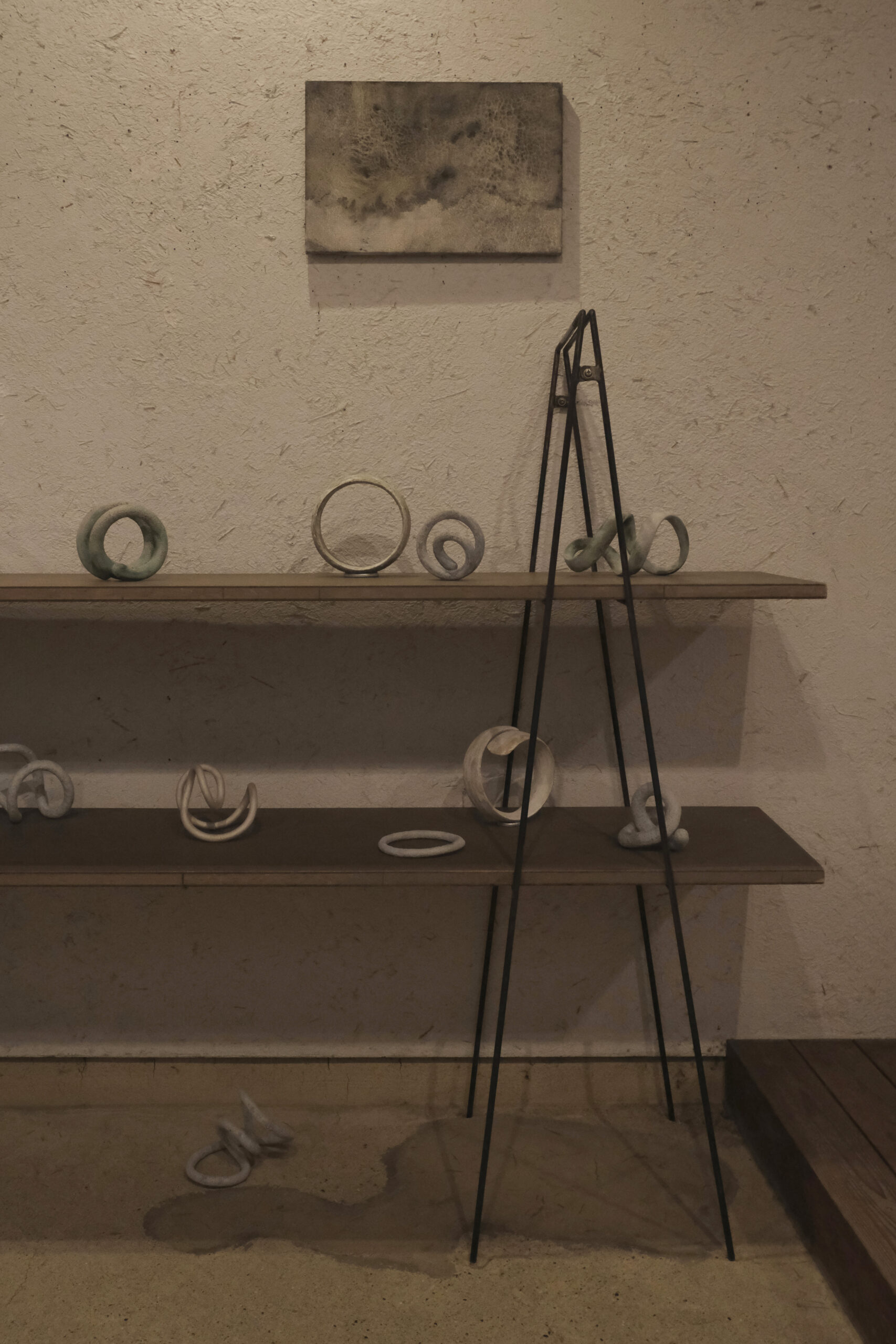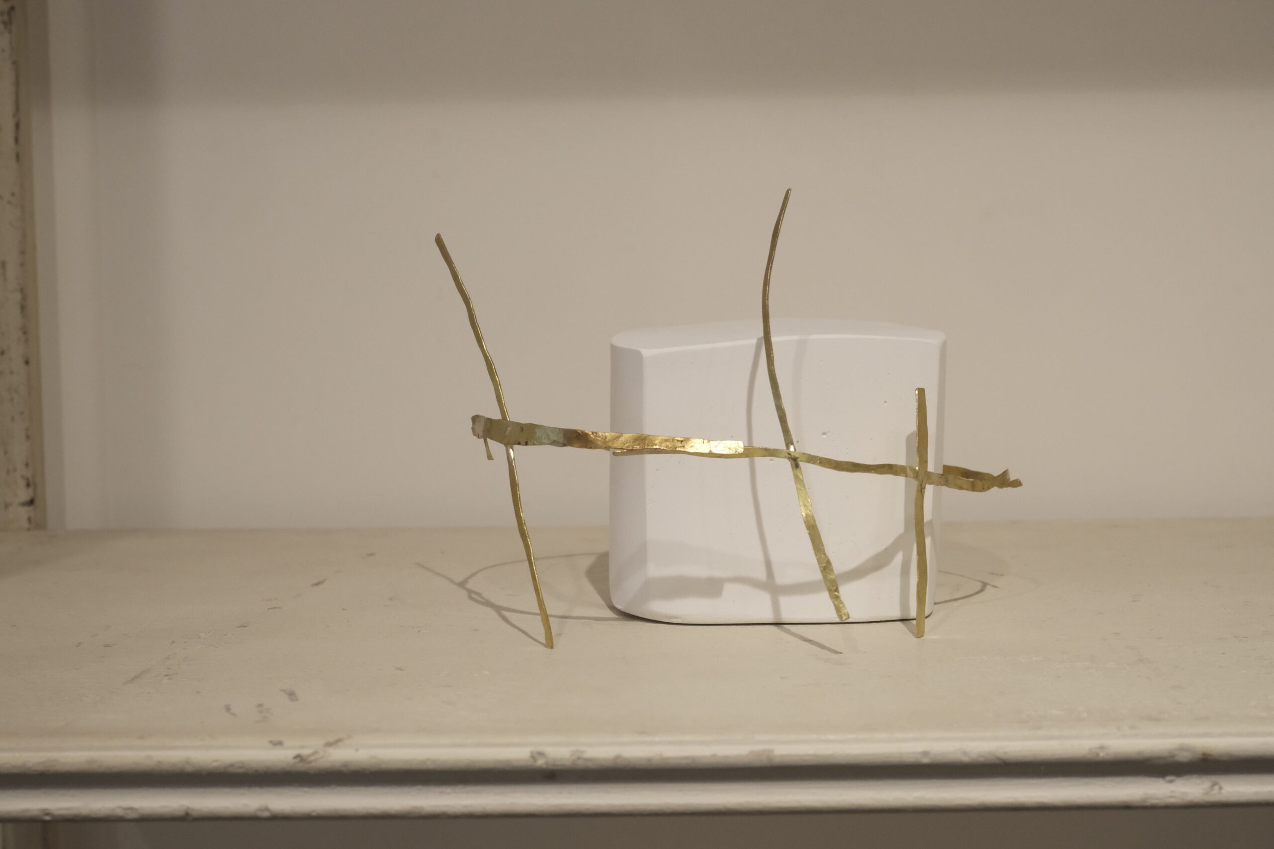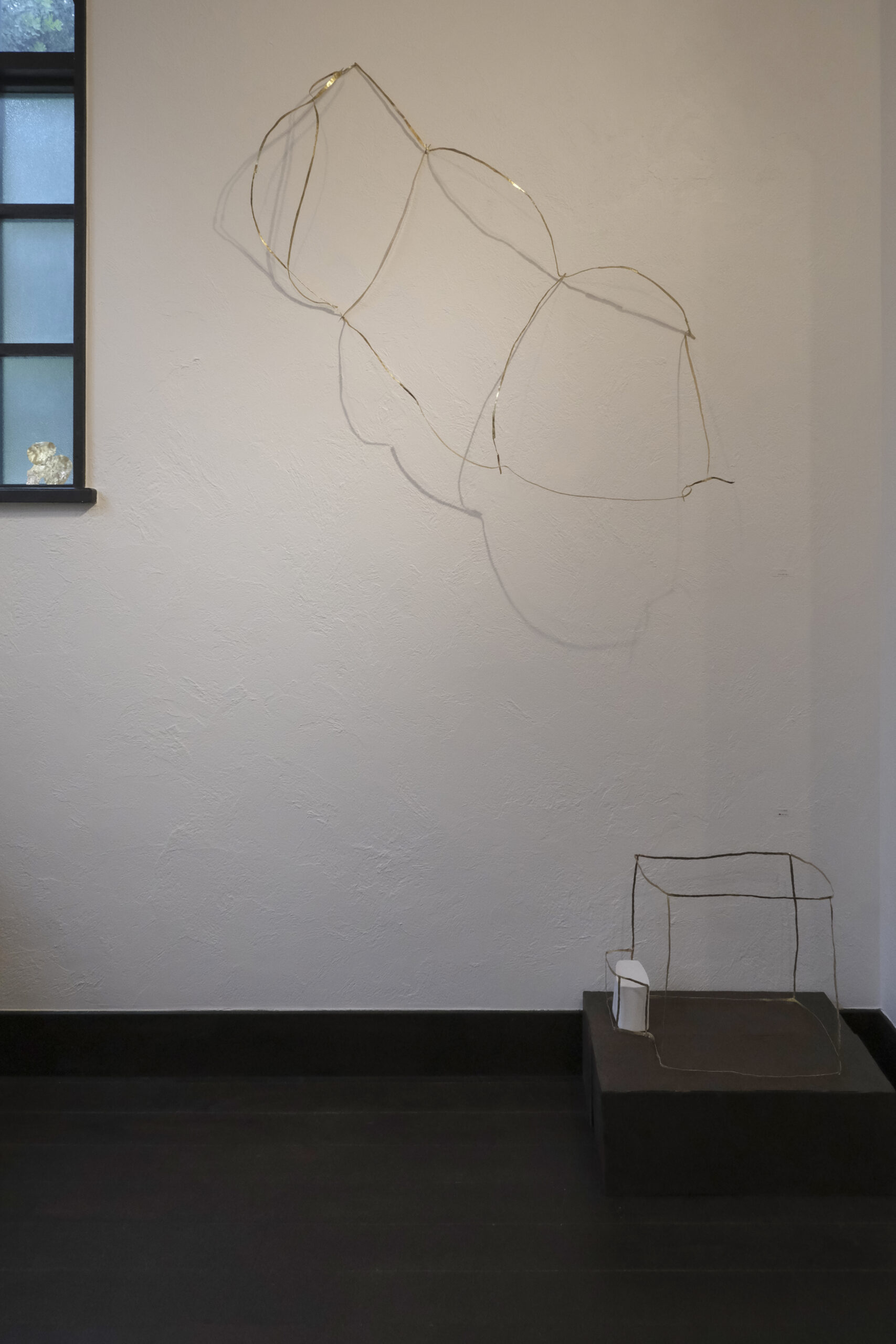 石膏の部分が先につくられるという。真鍮の部分は、容器のようでもあり、まとわりつく、よりかかる、囲う、流れる、なにかでもあろうか。拡張された空間が感じられる。壁や、作品が置かれている水平面に影が落ちている。作者の話を聞く。個々の作品はもとは、風景であったり、ものであったりするという。壁にある作品にとっての壁や、この建物、あるいはギャラリーと、石膏の物体とは類似していないか問う。壁と石膏には関連がありそうであった。