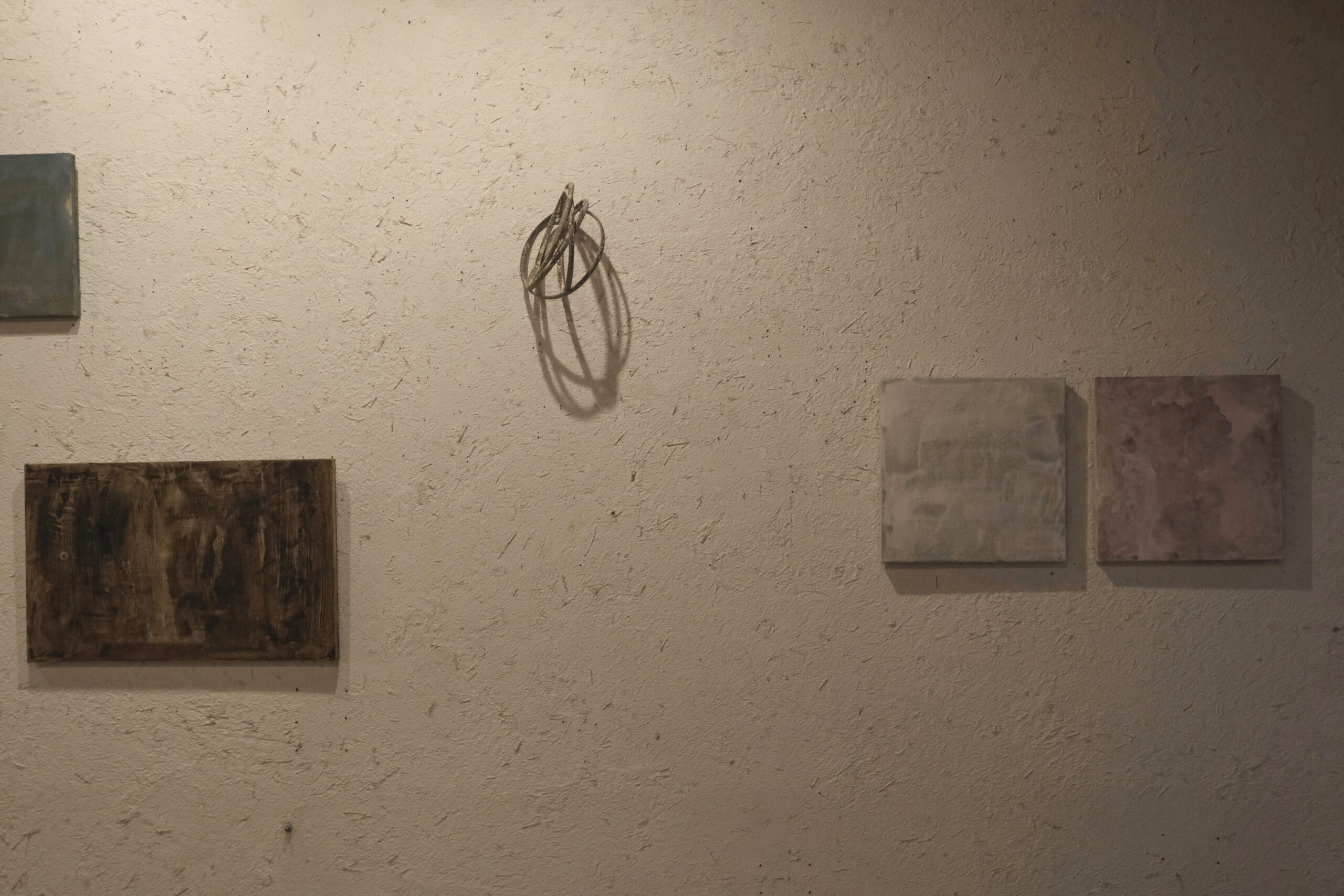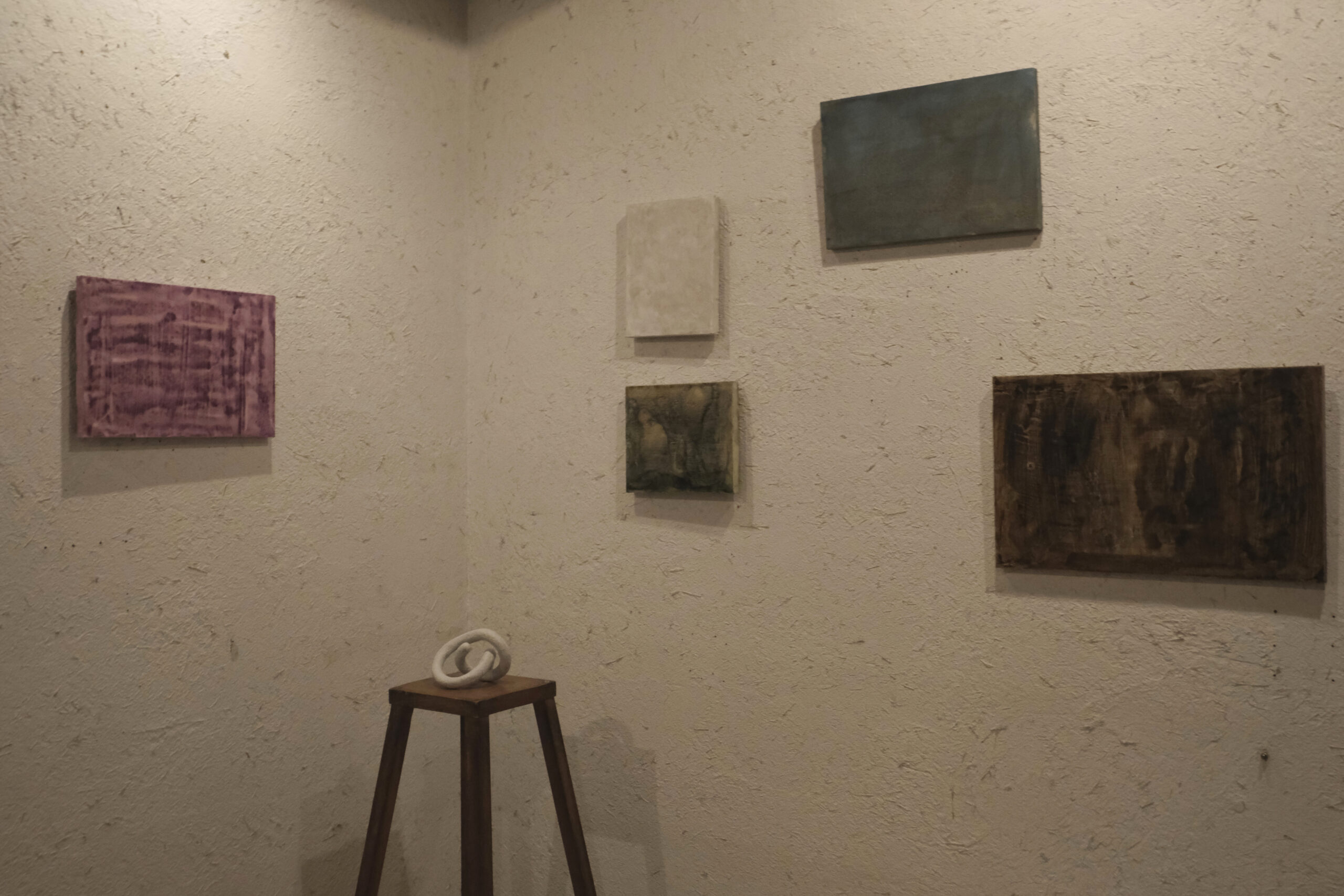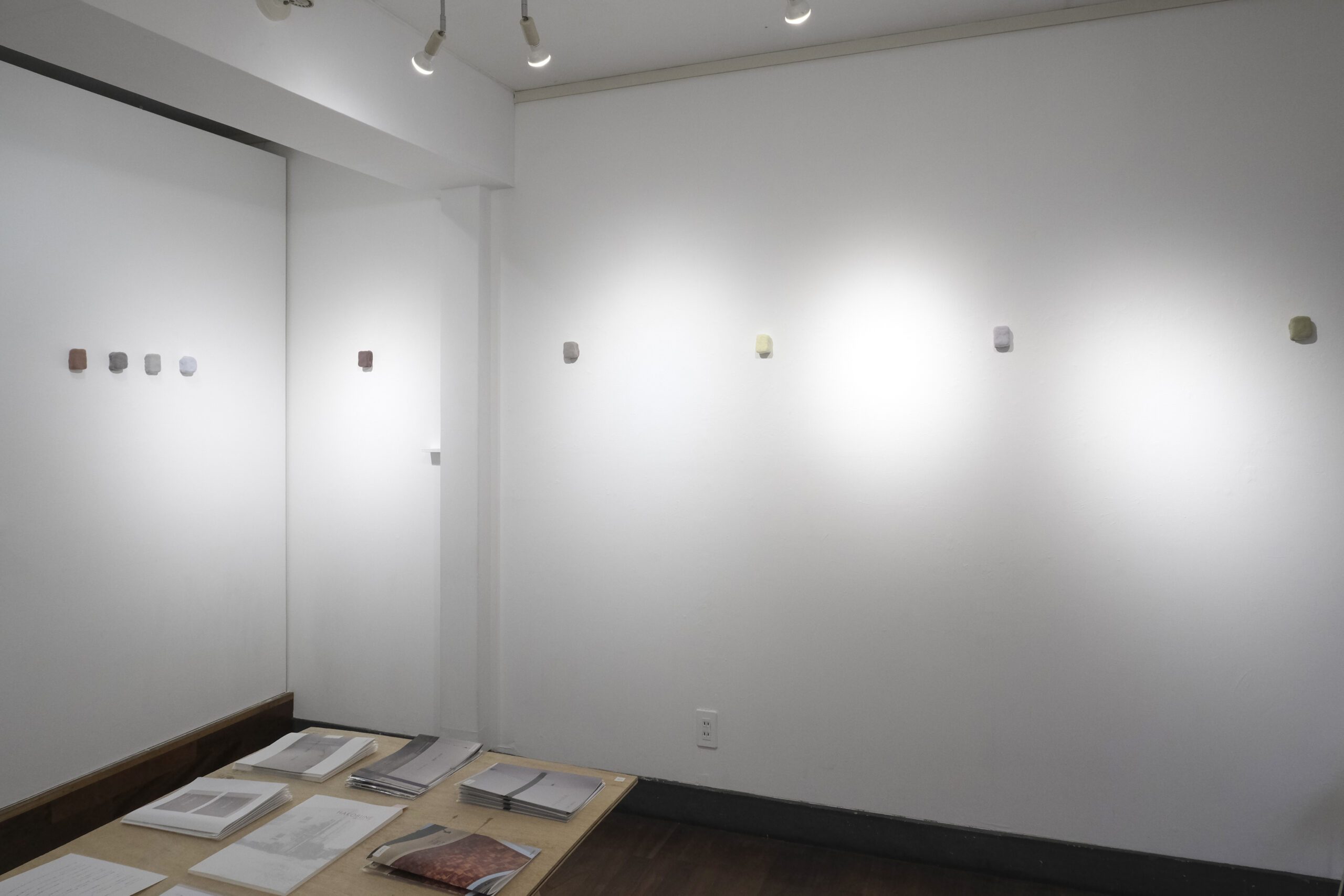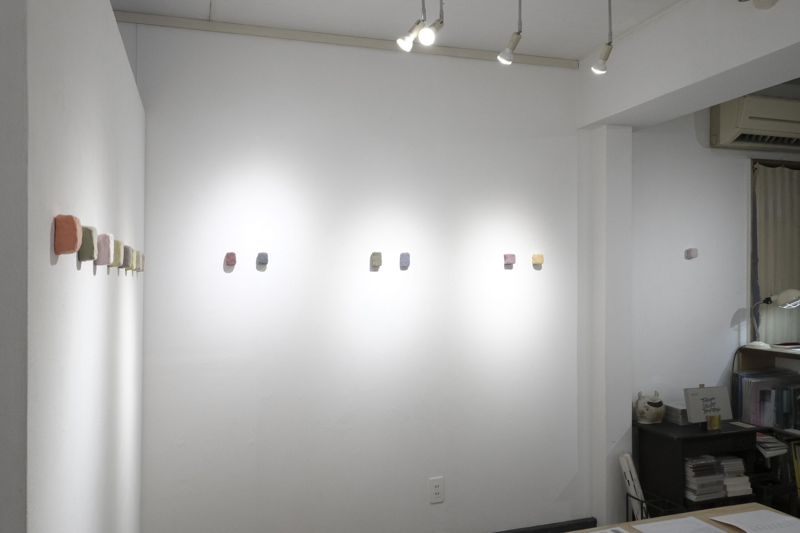 展示スペースに入って左側の壁。両手のひらに収まるくらいの大きさの四角い作品が8つ、ほぼ等間隔に並んでいる。それぞれ異なる淡い色彩。厚みがある。作品下部の壁に影が伸びている。その右側の壁には、同様の作品が6つ、2つ組みが間隔を開けて3つという具合に、先ほどの壁のものよりすこし上側に列をなして並べられている。いつの間にか、白い壁を見ている。これまでここで行われてきた展示の痕跡がある。天井の照明を見る。どこを照らしているか。展示されているひとつひとつの作品はとても小さい。側面を観察する。絵画作品の側面というより、物体の横のところ、という感じがする。正面と見えている面は、正面というあり方を逃れているのかもしれない。歩みを進めると柱があり、展示空間と事務空間のあいだを媒介するようにひとつ作品がある。その向かいの壁には、ほかより離れた間隔で4つ、あるいは、柱を挟んだ左側の狭い壁へ、4つの延長のようなひとつも加えて5つが列をなして並んでいる。その左側、つまり入口から見て正面の壁には4つ。