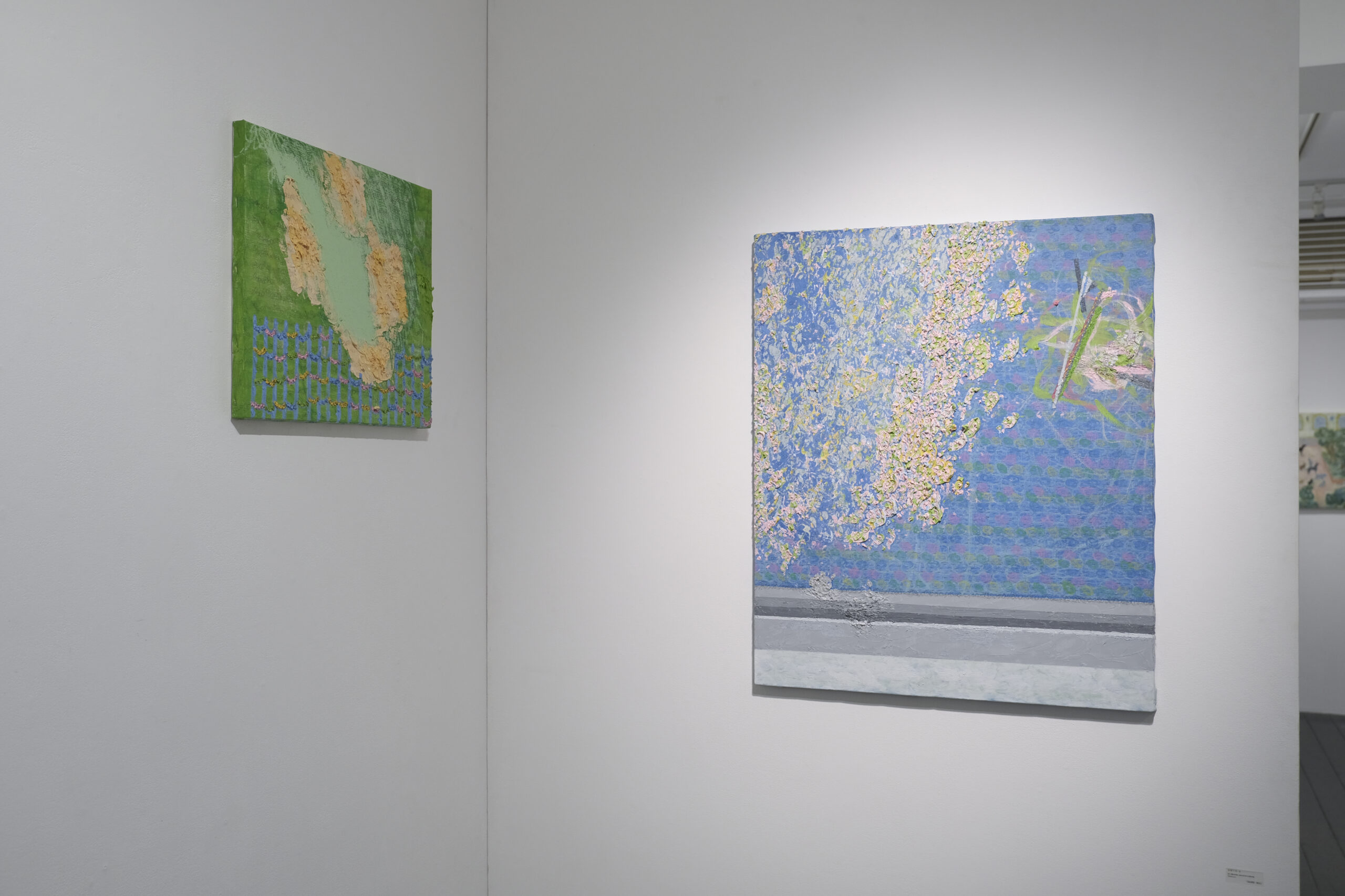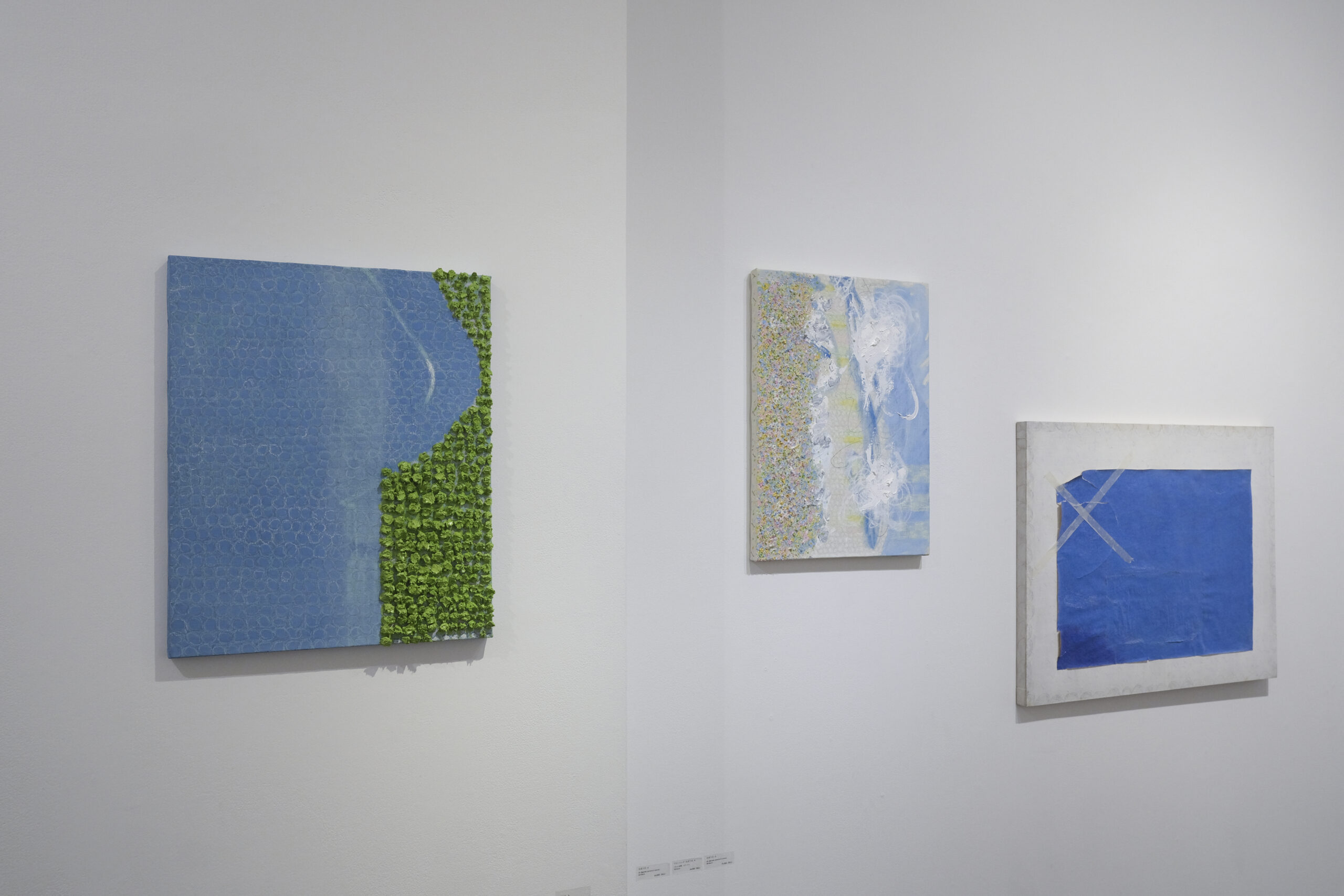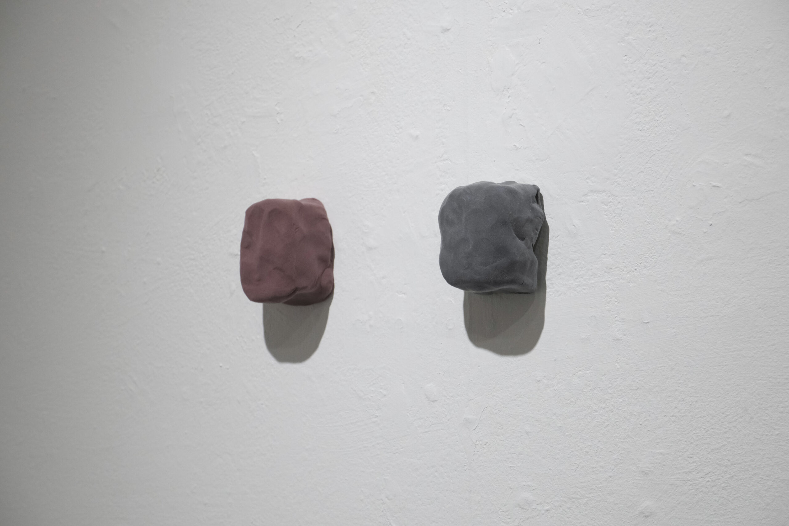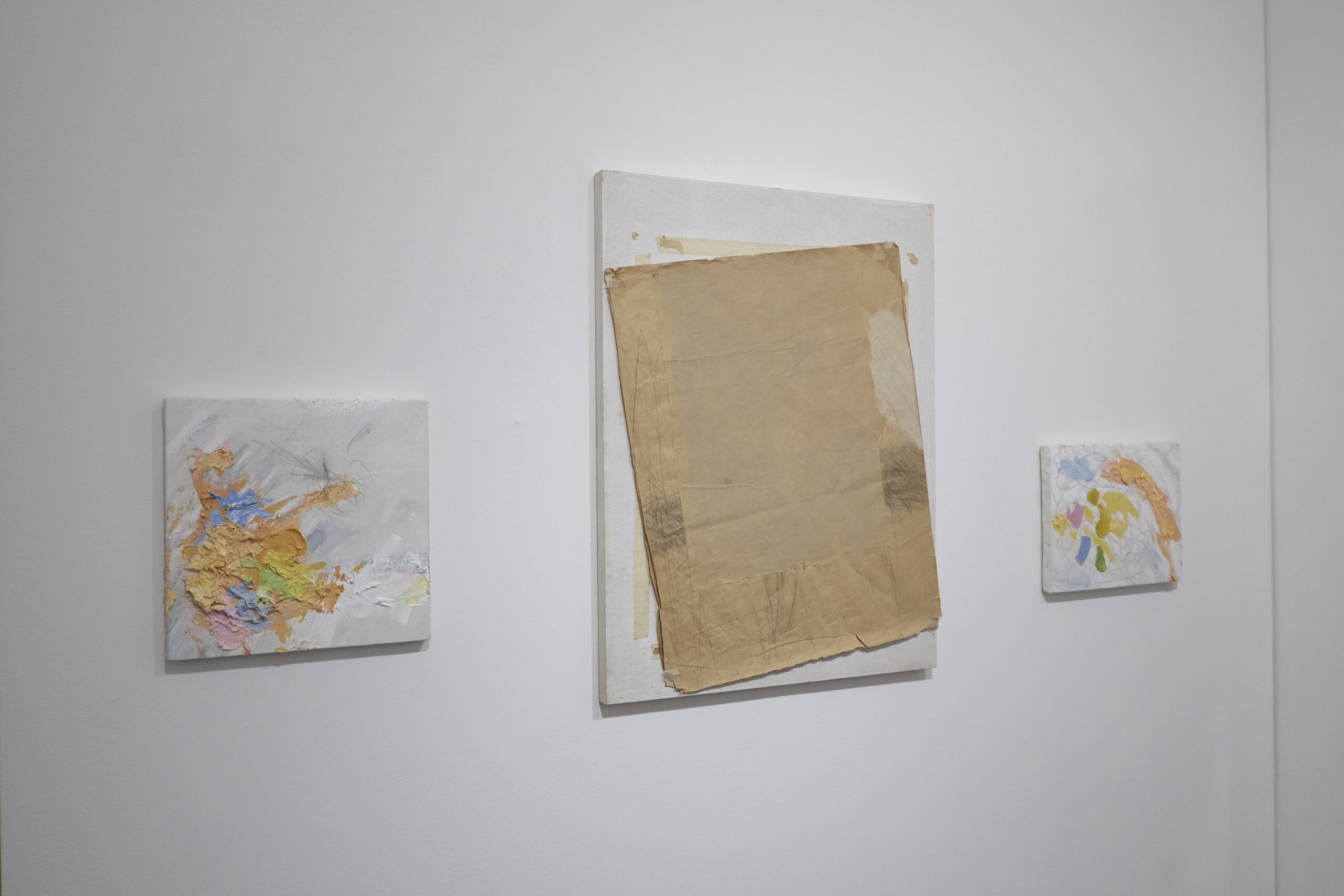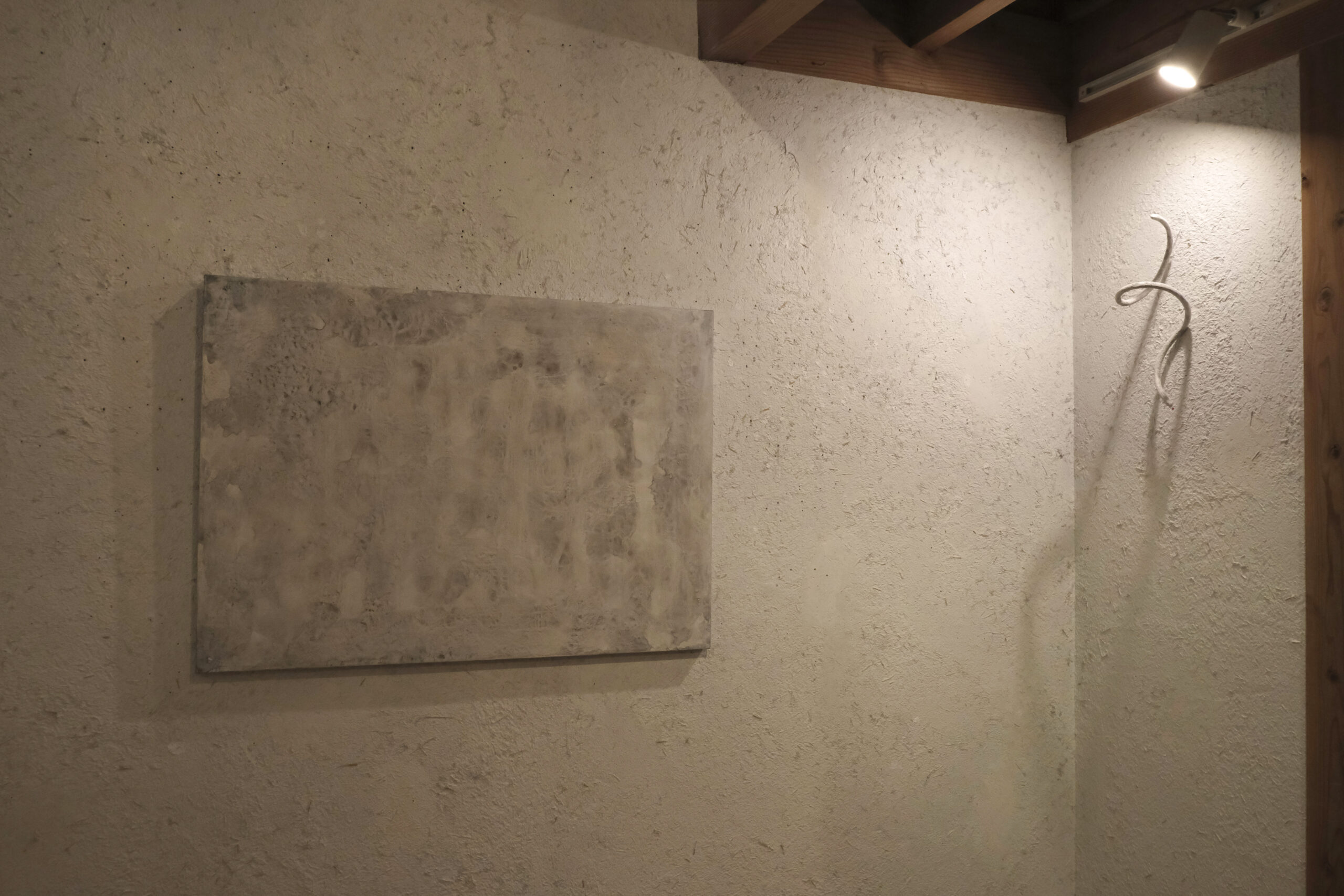 展示スペースに入って左側の壁。両手のひらに収まるくらいの大きさの四角い作品が8つ、ほぼ等間隔に並んでいる。それぞれ異なる淡い色彩。厚みがある。作品下部の壁に影が伸びている。その右側の壁には、同様の作品が6つ、2つ組みが間隔を開けて3つという具合に、先ほどの壁のものよりすこし上側に列をなして並べられている。いつの間にか、白い壁を見ている。これまでここで行われてきた展示の痕跡がある。天井の照明を見る。どこを照らしているか。展示されているひとつひとつの作品はとても小さい。側面を観察する。絵画作品の側面というより、物体の横のところ、という感じがする。正面と見えている面は、正面というあり方を逃れているのかもしれない。歩みを進めると柱があり、展示空間と事務空間のあいだを媒介するようにひとつ作品がある。その向かいの壁には、ほかより離れた間隔で4つ、あるいは、柱を挟んだ左側の狭い壁へ、4つの延長のようなひとつも加えて5つが列をなして並んでいる。その左側、つまり入口から見て正面の壁には4つ。