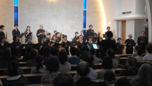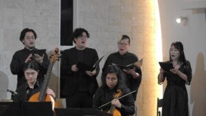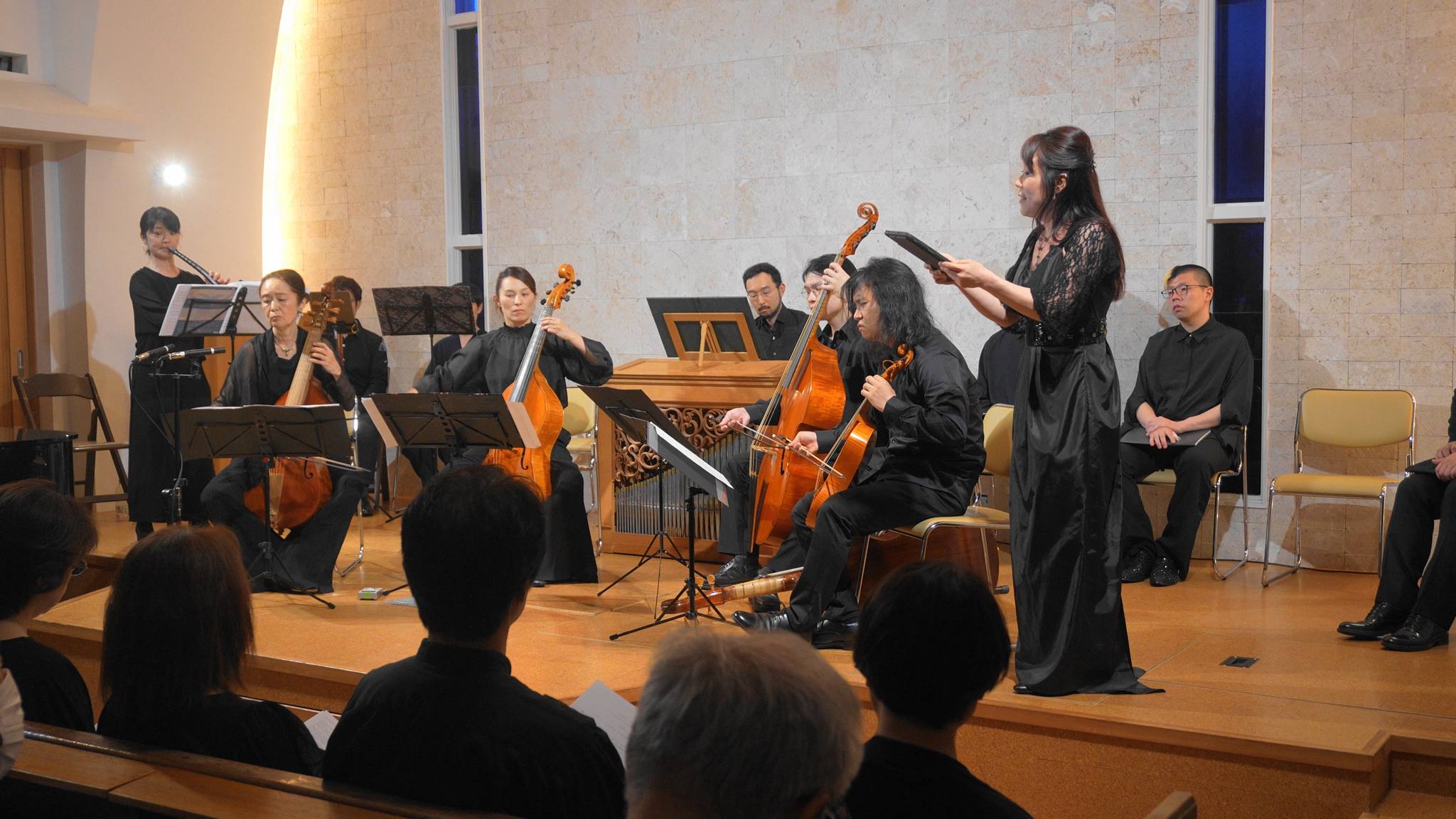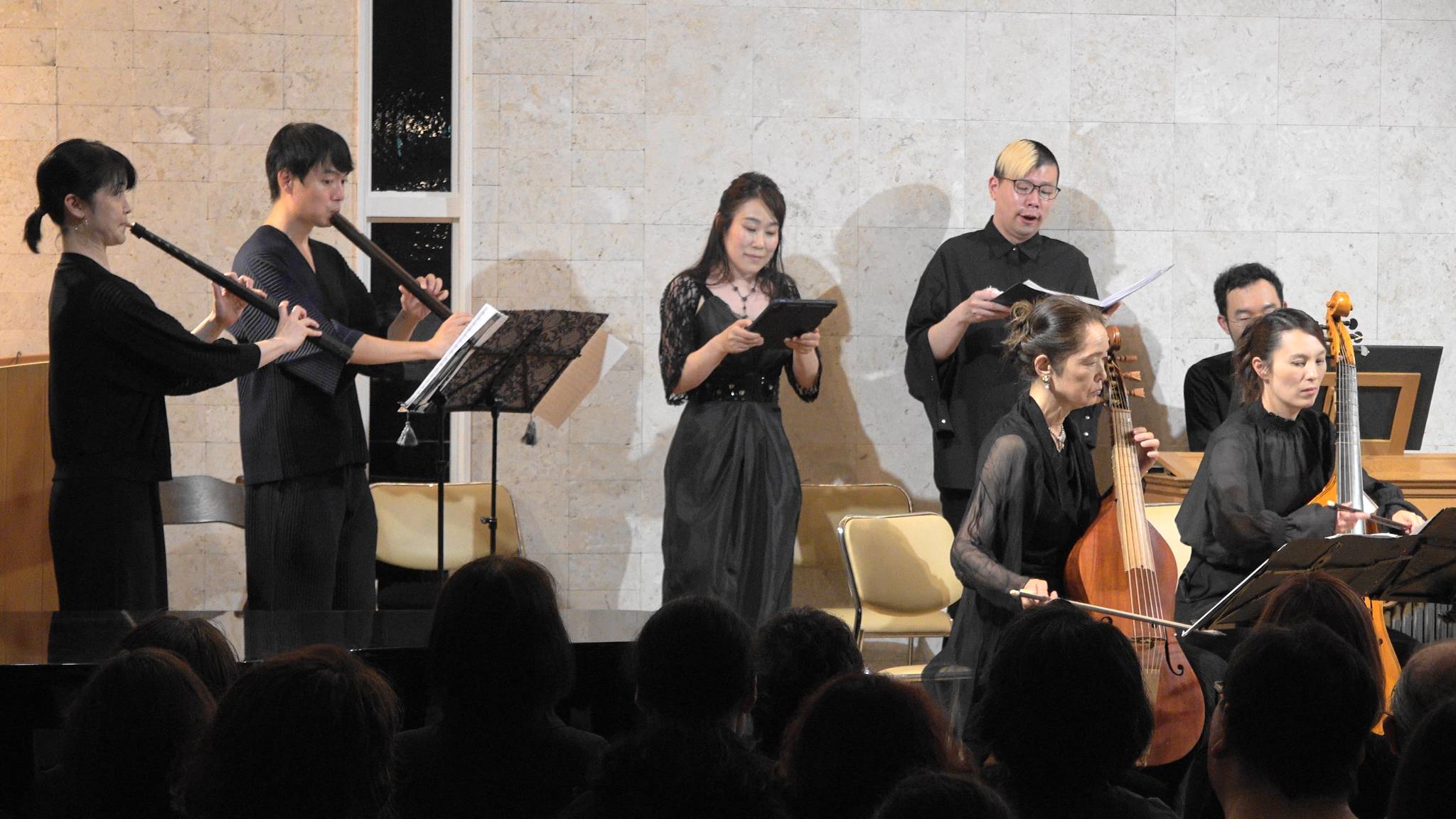 コンサートの前半はペトロ岐部がローマに入るまで、後半はローマ滞在から列福までを音楽でたどる。《千々の悲しみ》から始まり、よくあるパターンかと思いきや、何か違う。伴奏なしの4人だけの歌からフル楽器の伴奏まで、さまざまな編成で演奏される曲は、グレゴリオ聖歌、ミサ曲の一部、宗教曲、世俗曲とこれまた多種多様だが、雑多な感じはせず、どこか一本筋が通っているように感じた。若手精鋭たちの演奏の持つ説得力ゆえであろう。