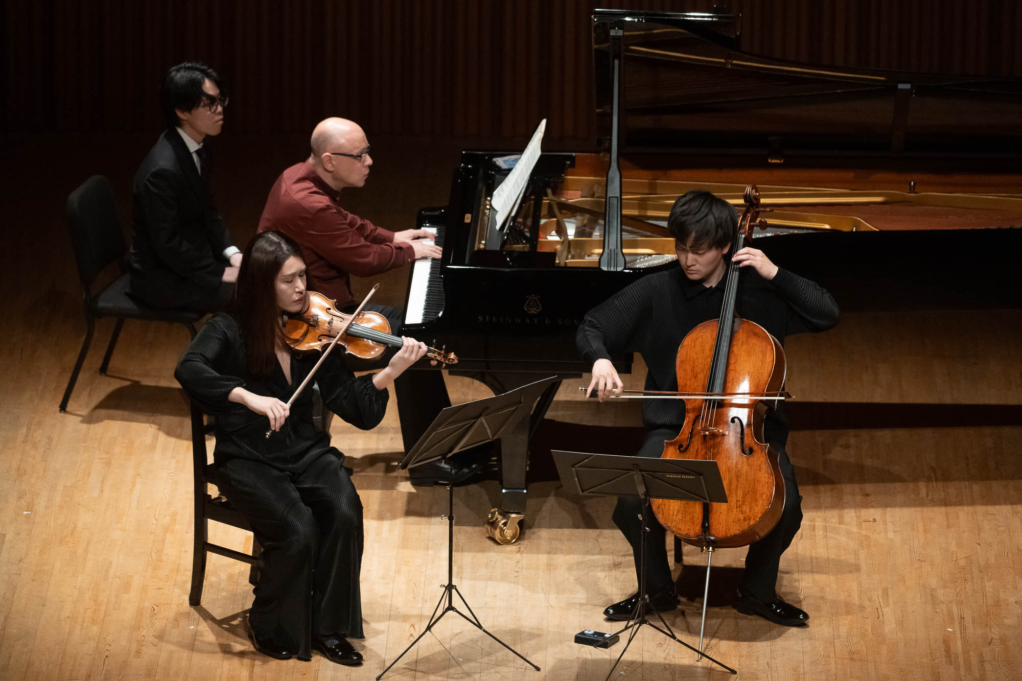 この点、トーマス・ヘルを挟む形で、若い2人の弦楽器奏者は、引き絞られた弓のような緊張感を保ったまま、終始白刃の上を歩くようにしてアンサンブルを展開し、聞き手も間断なく集中を要求されるのだが、率直に言えばこのアプローチからは、この三重奏にも本来埋め込まれているユーモアの射程や引用の多層性はあまり見えてこず、苦悶の表情の一本道がずっと続くような苦しさがあった。