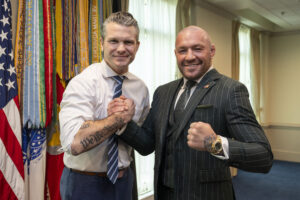 ヘグセス国防長官の腕には、We the Peopleの入墨が見える。上腕には、ラテン語のDeus Vult「神がそれを望まれる」が彫ってある。この言葉は、十字軍出発の鬨の声として知られ、イスラム嫌いのキリスト教ナショナリストに大人気だ。