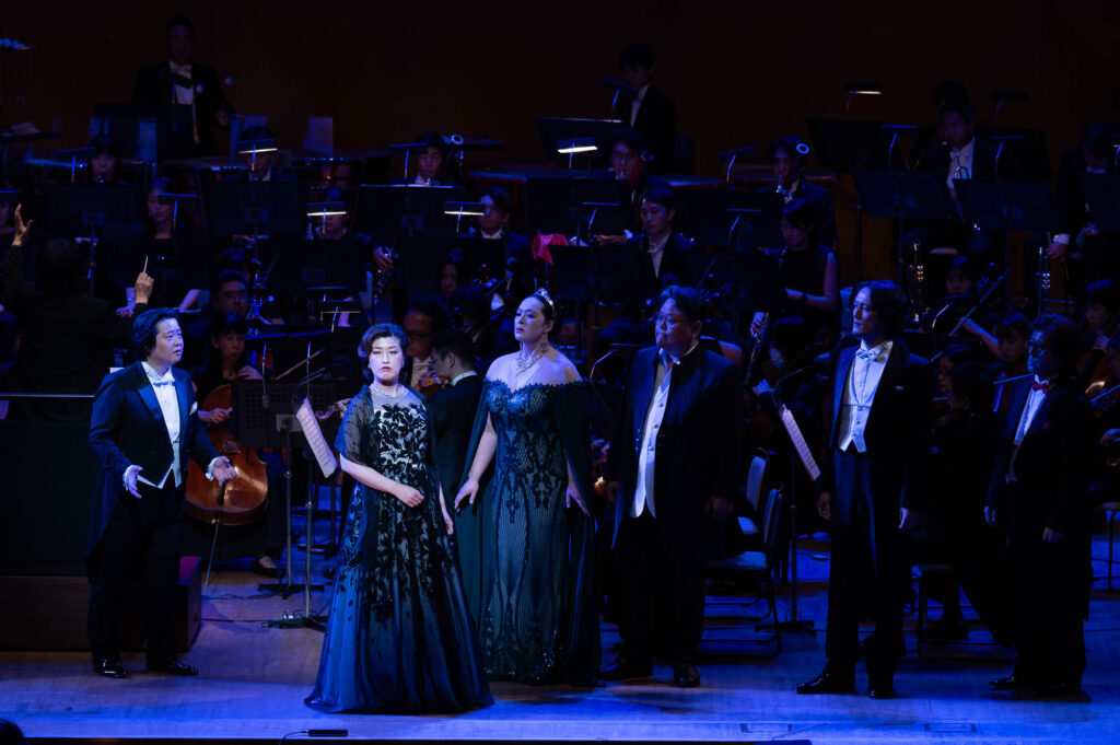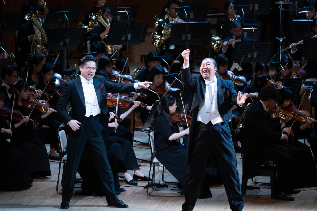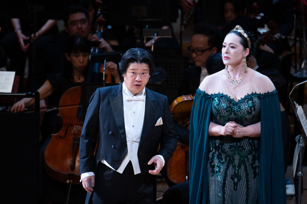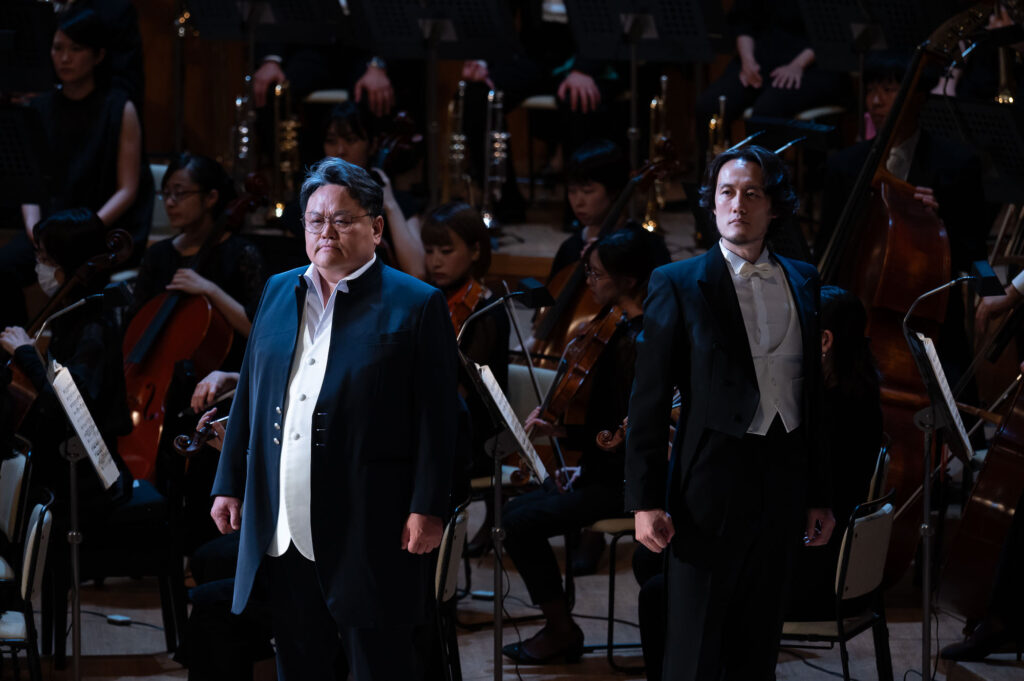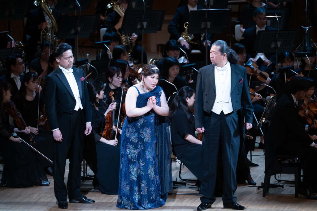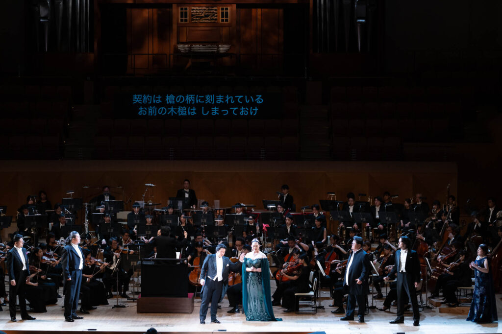 ヴォータン役の青山貴は、威厳と焦燥を織り交ぜながら“神の矛盾”を丁寧に演じきる。フリッカの谷口睦美、ローゲの澤武紀行、それぞれとの息詰まるやりとりも聴きどころの一つだ。アルベリヒ役の志村文彦は、不気味な存在感を醸し出し“呪い”の重みを体現。ファーゾルト役の妻屋秀和の愛に揺れる巨人像は、ファフナー役の斉木健詞の欲望に突き動かされる巨人像と対比的に描かれる。さらに聞き逃せないのが、エルダ役・八木寿子の登場シーン。出番自体は短いものの、その声と舞台を制する佇まいは、未来(『ワルキューレ』以降)を期待させる力がある。また、キャストにはベテランのみならず、船越亜弥(フライア)、秋本悠希(ヴェルグンデ)、黒田祐貴(ドンナー)といった若手も起用され、多様な声の色彩が作品の厚みを一層引き立てた。