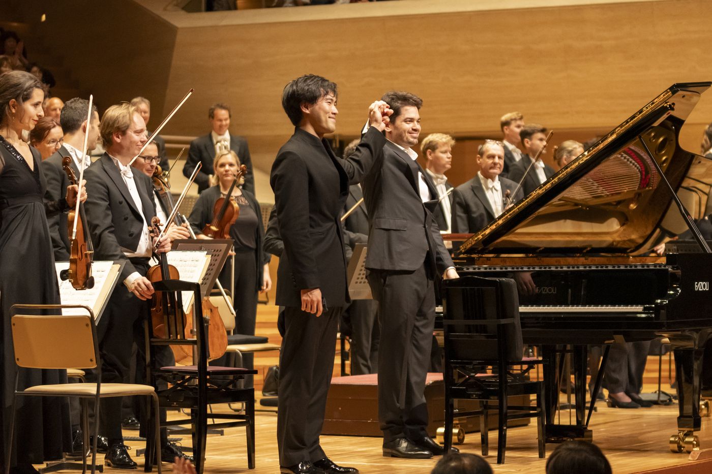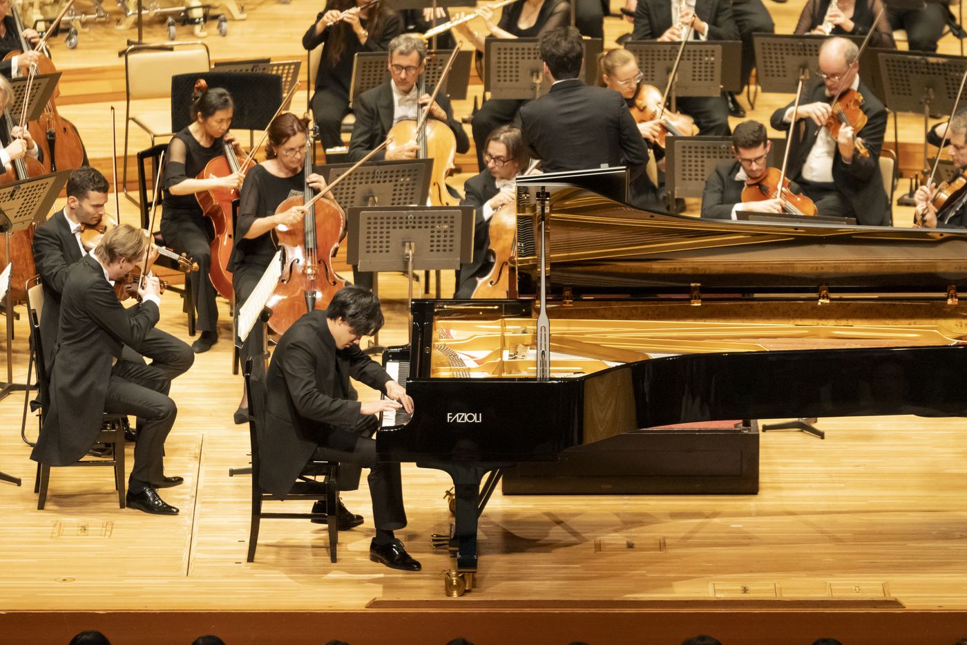 マルタ・アルゲリッチの録音しかり、聴衆の脳裏にはこの曲目のさまざまな名演の記憶がすでに刻まれているはずだが、ブルース・リウのアプローチはそのどれとも異なる。彼は、ともすれば疾走感とともにドライヴすることが期待されそうな走句―たとえば第一楽章後半にクレッシェンドからの主題回帰を導く上行音型―を、丁寧にマルカートで強調し、むしろゆっくりとそれと戯れる。このとき燻銀な彼のファツィオリは、まるで大小さまざまの貴石でできたプリペアドピアノのように、毎回少しずつ異なる、しかしいずれもきわめて堅く撥ね付けるような輝きを放つのだ。わたしは彼のショパンを聞いたときにそこまで強い印象を受けなかったのだが、この一種独特な硬度の美学はプロコフィエフと実によく響き合う。第二楽章では彼のタッチコントロールの精密さが披露され、オーケストラの細密な線のうえに、一抹の絵の具を跳ね散らすようにしてライブ・ドローイングを展開する。このときブルース・リウは背後で展開するオーケストラの音の飛び交う範囲をしっかり見極めていて、またオーケストラと指揮者もピアニストの音のくっきりした形態を把握しており、互いの音が浮き立つような位置どりを十分にはかった上でソリストが演奏するので、プロコフィエフのこの聞き慣れた協奏曲に、今まで気づかなかった音符をたくさん発見したくらいだ。指揮者のラハフ・シャニがこれらを統括する役割を十二分に果たしたことは疑いなく、それはアンコールでブルース・リウと連弾した際のみごとな平仄の合わせ方を見ただけで理解できる。このプロコフィエフの演奏には、まるでカンディンスキーの絵画のように、区切り合う色彩と形が生み出す生命がある。これを越え出る演奏に出会うことはなかなかないだろうという域の収穫だ。