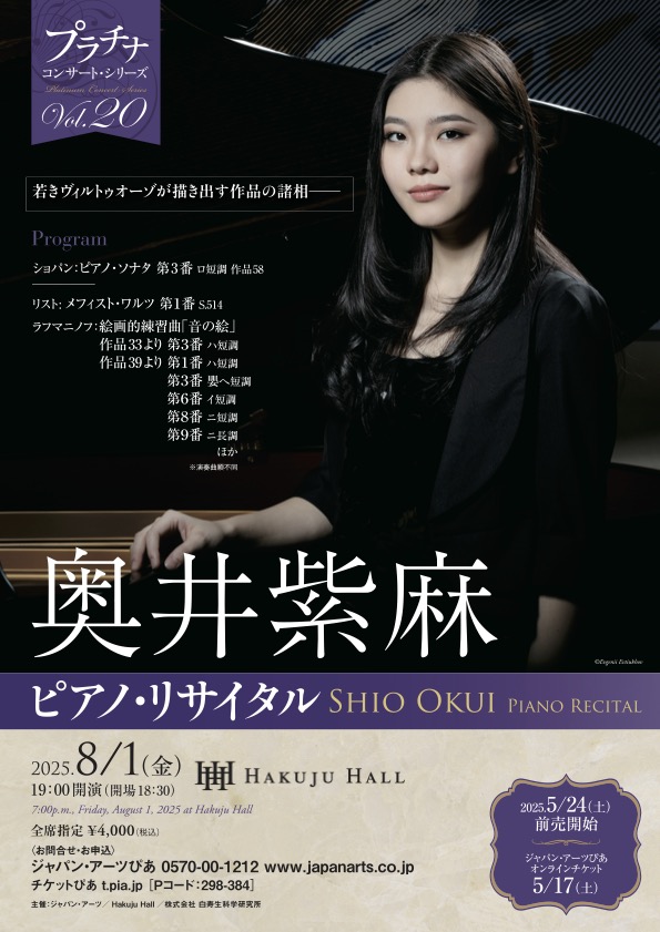 アーティストが今一番届けたいプログラムを、が趣旨の<プラチナ・コンサート・シリーズ>に2004年生まれのピアニスト奥井紫麻が登場。5歳半でピアノを始め、7歳より故エレーナ・アシュケナージに師事。モスクワ音楽院付属中央音楽学校を経てグネーシン特別音楽学校でタチアナ・ゼリクマンに学び、現在ジュネーヴ高等音楽院在学中の新星。ショパン、リスト、ラフマニノフとそれぞれの音楽世界を、「音の絵」の如く楽しんで欲しいとのこと。その清新なピアニズムに期待したい。