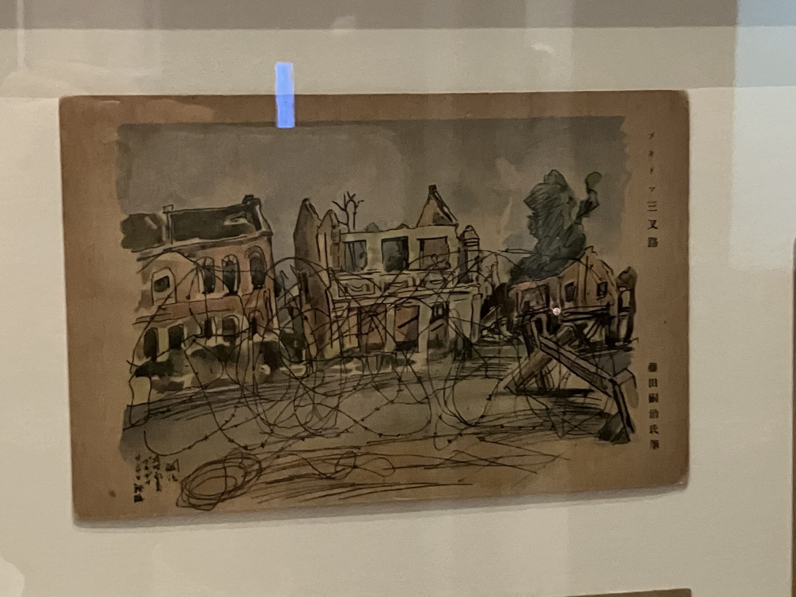 展示を順番に見ていると、シンガポールの風景を描いた水彩画が目に留まった。よく見るとそれは、藤田の絵である。これは日本軍から委嘱を受けた画家たちが描いた「戦争作戦記録画」で、2006年、日本軍のプロパガンダ部門に所属していたSakurai Takaという人物がシンガポール国立アーカイブに寄贈したものであった。日本軍の占領に関するミュージアムに展示された原画とポストカードは、小さく控えめながらも、戦争と芸術の関係を強く問いかける展示であった。