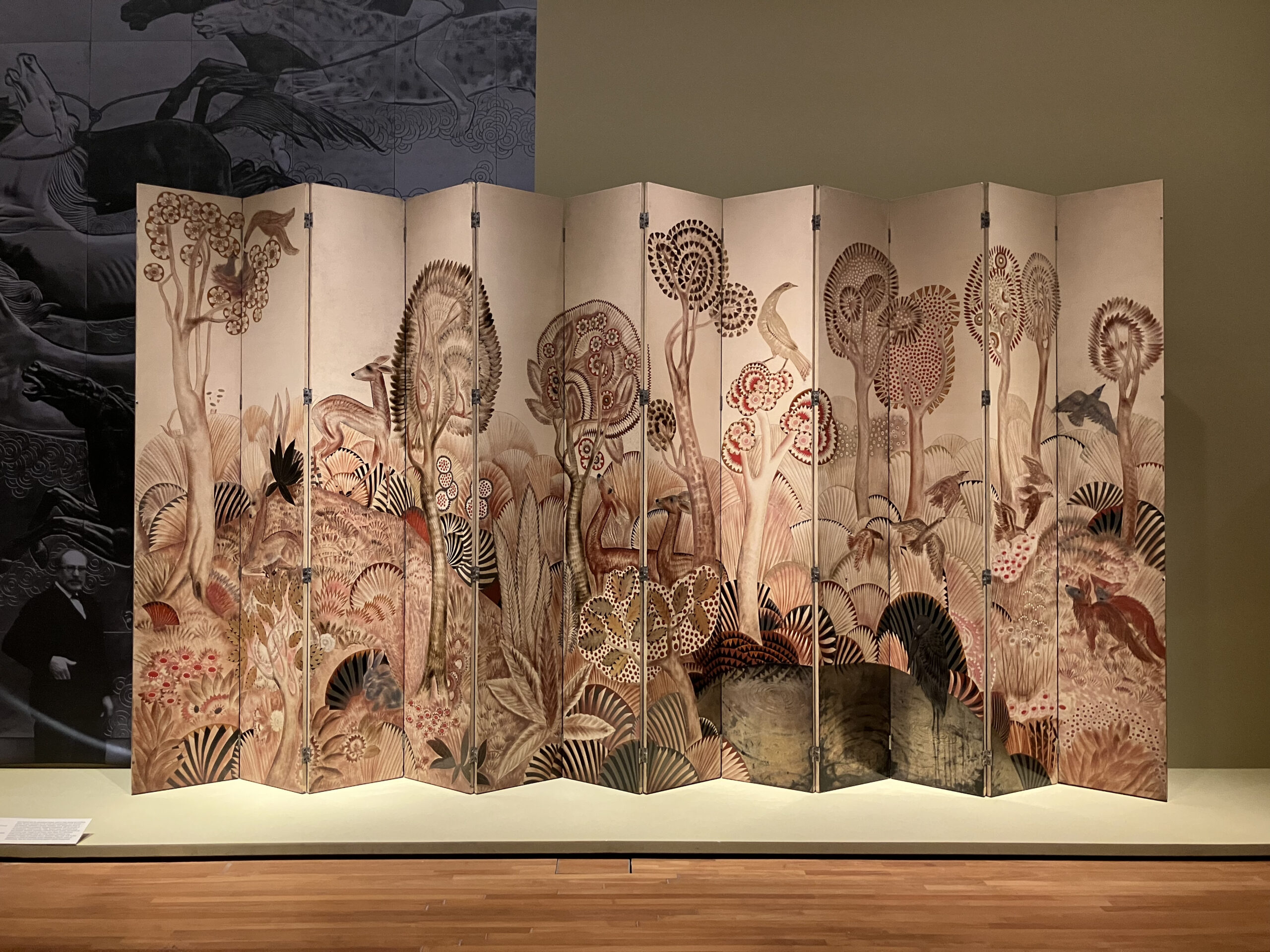展示されていたのは、1930年に制作された屏風式の漆画「La Forêt(森)」。ここでの植物の表現は、ベトナム人画家レ・フォー(Lê Phổ: 1907-2001)の同年の漆画作品「Paysage tonkinois(トンキンの風景)」での表現と類似しているように見える。デュナンの漆画はエキゾチックさを求めるアールデコの潮流と軌を一にするものであろうが、パリという場所での人と人の交流が生みだした表現であることに、なんだかときめきも覚える。