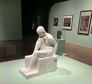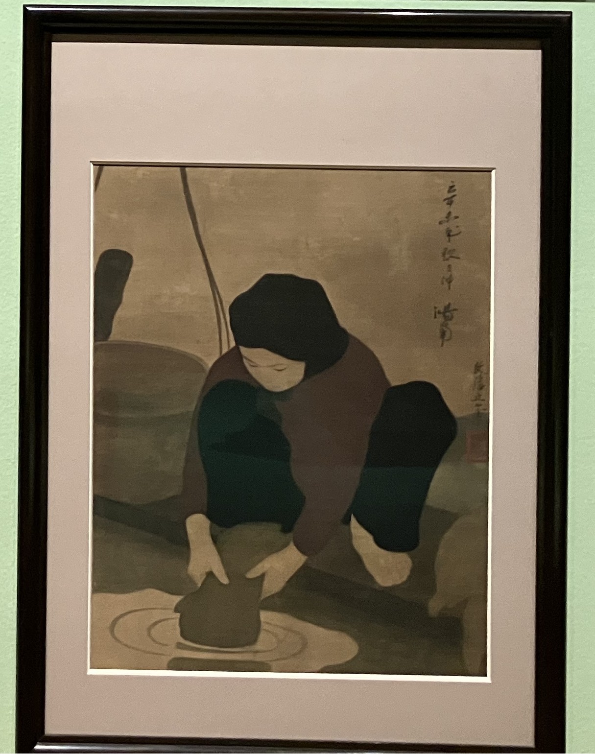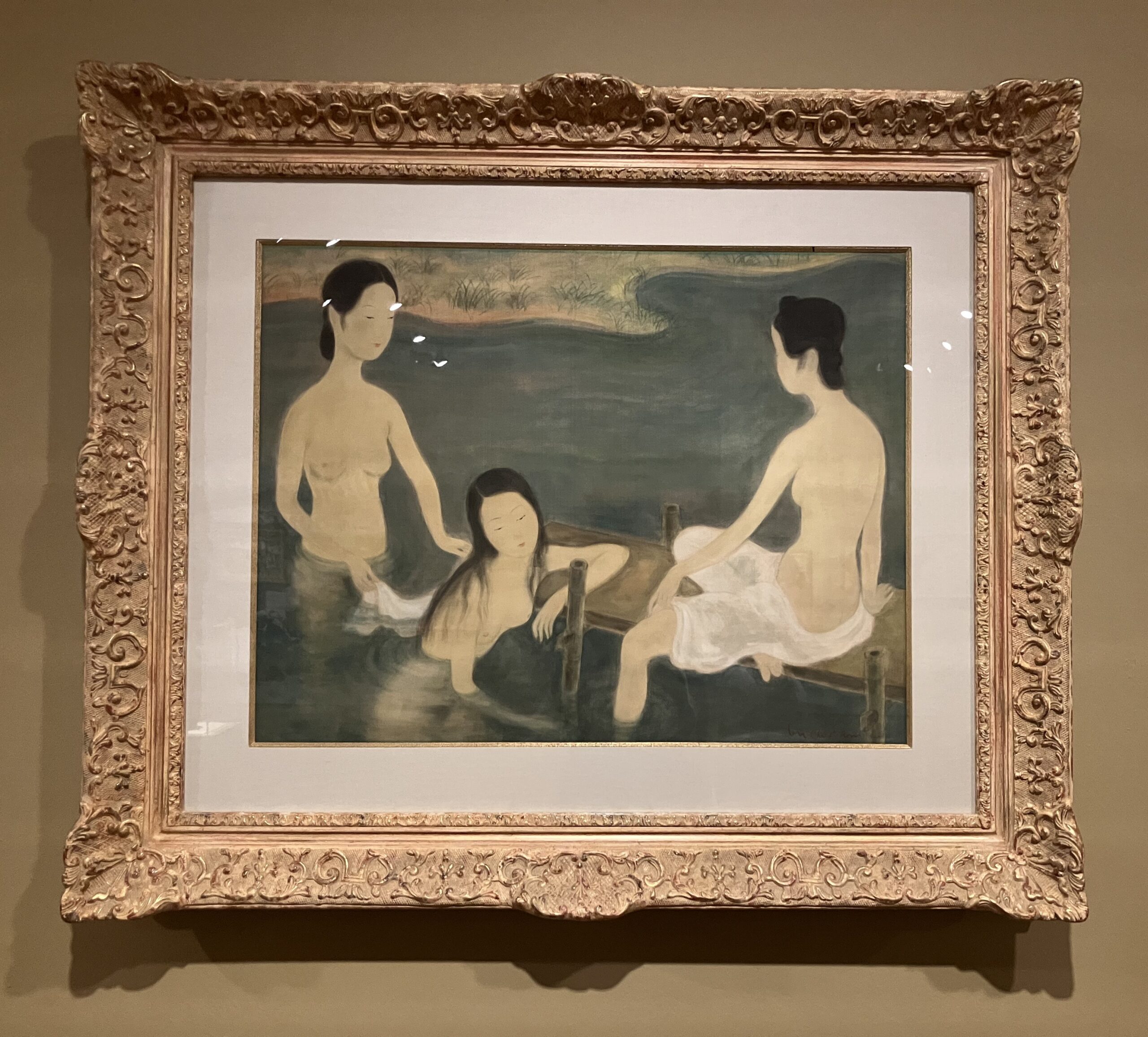 いずれも素材ゆえの柔らかい質感、それと調和するかのような曲線を持ち合わせており、心にすっと染み入る優しい作品であった。音楽を題材とした作品もあった(マイ・チュン・トゥは音楽を愛好しており、自らダンバウというベトナムの一絃琴を嗜んでいたという)。一方、優しいながらもこんな作品もあるのか、と私が意外性を感じたのは、男性の役人を描いたヴー・カオ・ダン作「Le Mandarin(官吏)」だ。また、別のセクションで展示されていた同じくヴー・カオ・ダンによる「Trois baigneuses(3人の入浴者)」は、乳白色の肌と繊細な髪質が美しく、北部ベトナムの3姉妹を描くトラン・アン・ユン監督の映画「夏至」や封建時代の3人の夫人を描くアッシュ・メイフェア監督の映画「第三夫人の髪飾り」を想起させた。
