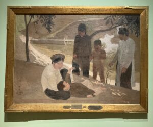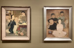 一方で、当然のことながらベトナムはフランスの植民地であった。その文脈を前面に押し出したのが、セクション2「Theatre of the Colonies」である。1931年にパリで開催されたインドシナ植民地博覧会は現地の画家がパリで認知されるようになるきっかけを与えたイベントであり(二村 2021: 41)、今回の展覧会では、1930年代パリで注目された絹絵の代表的画家グエン・ファン・チャン(Nguyễn Phan Chánh: 1892-1984)や前出のレ・フォーの油絵、他にもトー・ゴック・ヴァン(Tô Ngọc Vân: 1906-1954)の絹画、ヴー・カオ・ダン(Vũ Cao Đàm: 1908-2000)の彫刻などの作品が展示されていた。