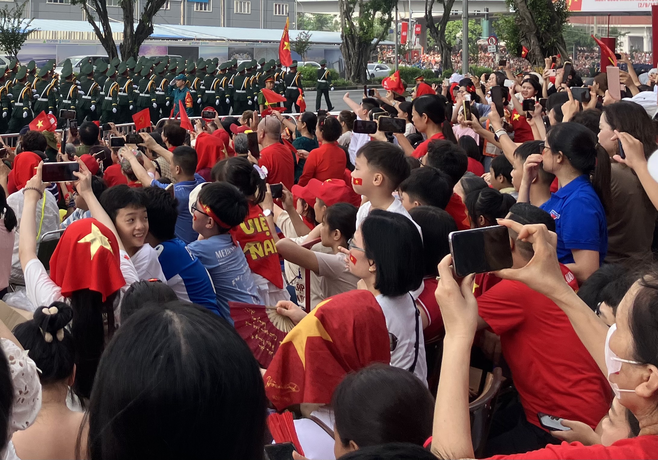当日の朝、朝6時半からバーディン広場(1945年9月2日にホー・チ・ミンが独立宣言を読み上げた広場)で式典が実施され、その後、バーディン広場を起点にハノイ市内へとパレードが始まった。私はテレビのライブ中継で式典とパレードの冒頭を見て、それから外に出て、大通りへと行ってみた。全く並ばなかったにもかかわらず幸いなことに、多少背伸びをすれば、パレードを見ることができた。観衆は小さな国旗を手に持ったり、愛国的なファッションを身につけたりして、軍隊、公安、警察などの行列がやってくる度に歓声を上げている。行列の中から手を振る人がいるとさらに甲高い歓声が鳴り響き、まるでアイドルが目の前にやってきたかのような歓迎ぶりであった。