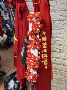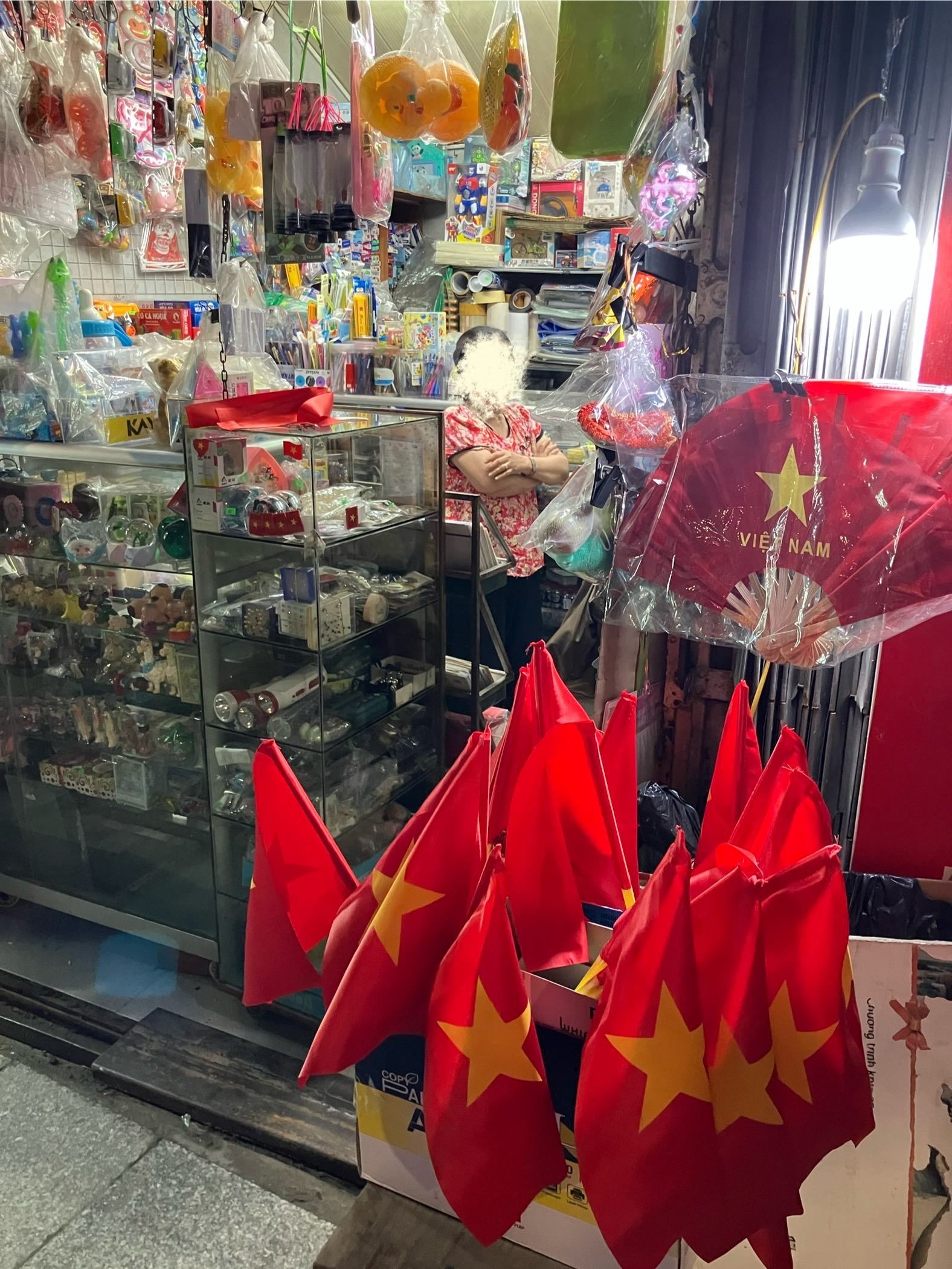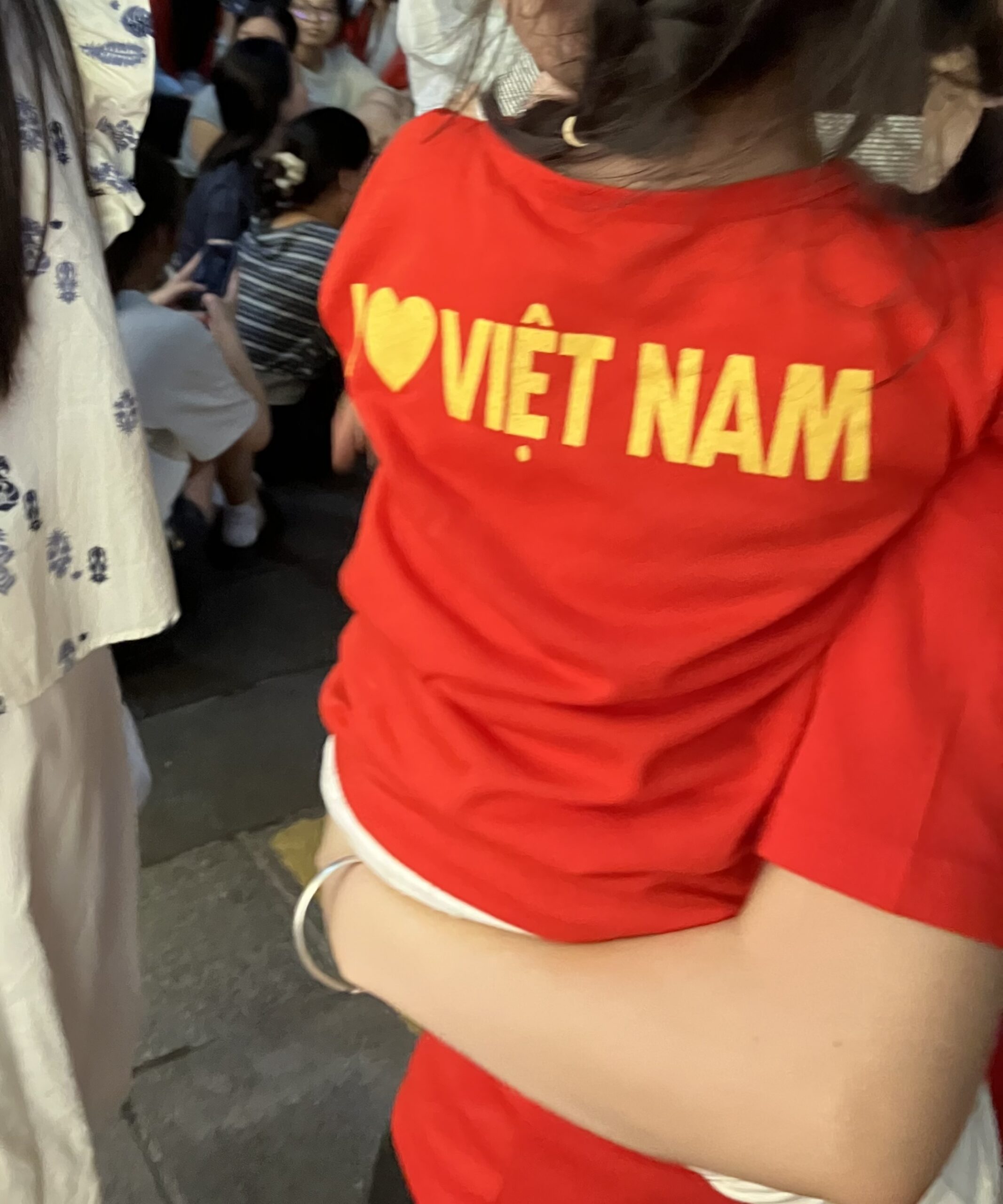 この日に向けて、街の風景も日に日に賑わっていった。いたるところに国旗、国旗、国旗、そして時折、鎌と槌をモチーフとする共産党の旗。これまでも国家的記念日を中心に、国旗の生産量はベトナムが世界一ではないかと思うくらい、いたるところに金星紅旗がはためいていたし、赤地に黄色い星がどーんと描かれたシンプルな国旗Tシャツをよく見かけたが、今回はこれまでとは比べものにならない数だったと感じる。ファッションでは、「独立、自由、幸福」というベトナム政府が掲げるスローガンを流用するなど、多様なデザインのTシャツやスカーフなども生産、販売され、SNSでも愛国的な姿の人びとの写真が次々にアップされた。こうして、私が建国80周年を過ごした首都ハノイは、愛国的な表現で埋め尽くされ、文字通り赤く染まったのである。