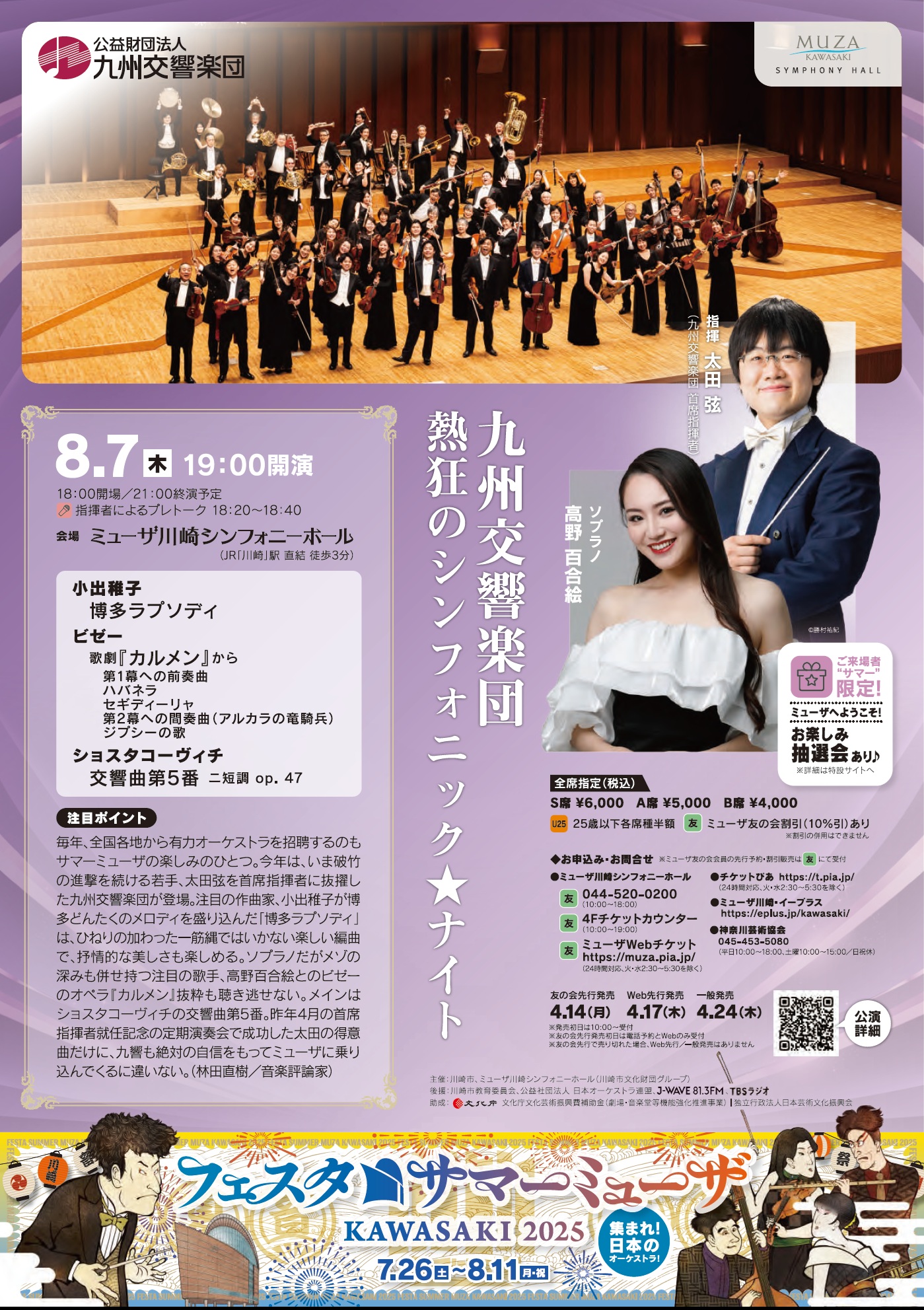 クラシック・ファンにとってはもはや「夏の風物詩」となった感のあるフェスタサマーミューザKAWASAKI。定期的に出演している在京オケに加えて毎回非在京オケ(地方オケとの言い方は控える)の参加が恒例となっているが、今年は初登場となる九州交響楽団(以下九響)。非在京オケの東京公演は最近どの団体もコンスタントに行っているが、九響が昨年2024年3月に小泉和裕のもとサントリーホールで開催したコンサートは実に20年ぶり、関東圏のファンには九響の実演はいささか縁遠いものだったと言えるだろう(事実、開演前のプレトークで九響芸術主幹氏の聴衆に対する「九響を初めて聴くという方は挙手していただけますか?」との問いかけにかなりの人数が手を挙げていた)。今回の九響公演は首席指揮者の太田弦がタクトを執り(これは慣用表現で太田はタクトは用いない)、しかも会場は最高の音響を誇るミューザ川崎である。このオケの実力を知らしめるに絶好の機会であろう。