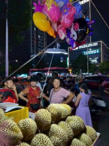 スイミーたちは歩道も容赦なく猛スピードで走る。ヘルメット着用は2割くらい。3割くらいが2人乗りで、夕方は後ろに子どもが乗っていることが多い。子どもたちはお弁当を食べたり勉強したりしていた。これ、バイクの後ろの席での話。信号が少ないからか、渋滞状態に見えてもスイスイ走っている。電動だから空気はキレイ。スイミーたちの背後の夜の電飾はギラギラで、まぶしくて目が痛かった。