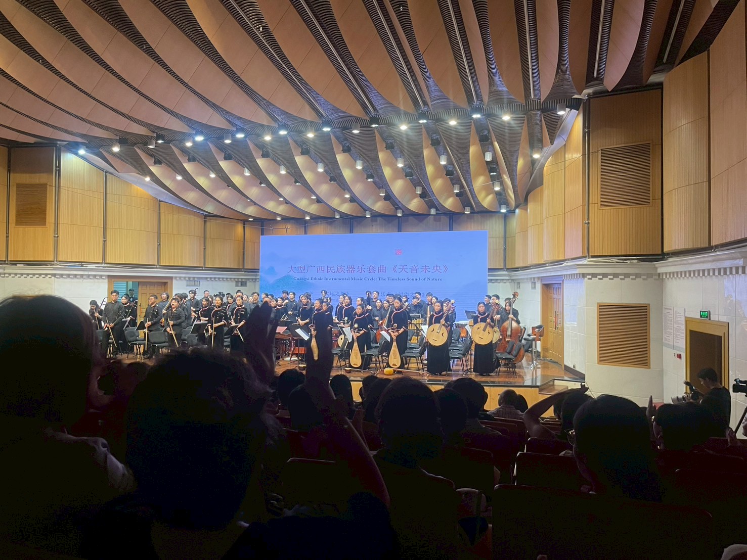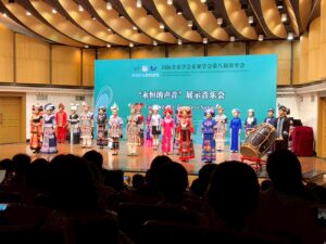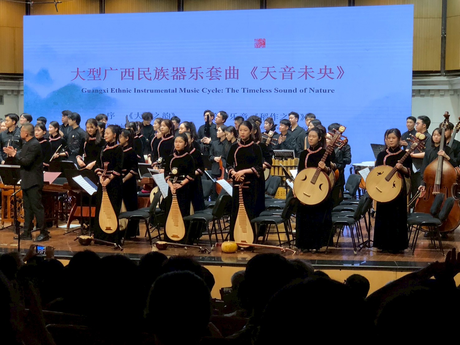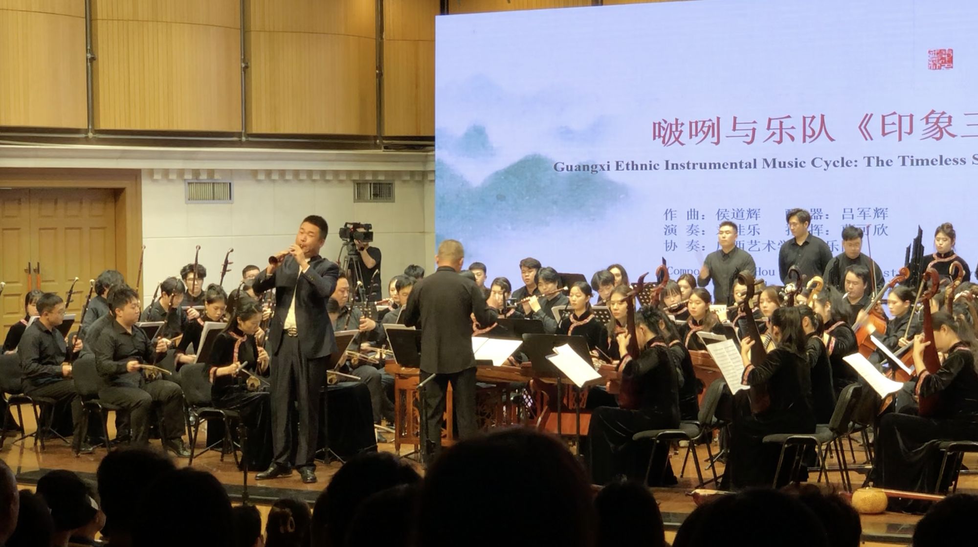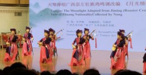 広西芸術学院の学生らによる歓迎演奏会もあった。度肝を抜かれたことは言うまでもない。踊りや歌など色々あったが、最も驚いたのは民族楽器によるオーケストラ。ヴァイオリンの代わりに二胡や月琴のような弦楽器が弾く。つまり、西洋楽器が民族楽器に置き換えられたオーケストラなのだ。おそらく低音の民族楽器が無かったのだろう、チェロとコントラバスだけそのまま使っていた。舞台いっぱいの大編成で、ド迫力で西洋風の現代曲(ハチャトリアン風)を聴かせてくれた。チャルメラのような民族楽器の協奏曲は、チャルメラの超絶技巧でまばたきも忘れたと思う。ひたすら吹きまくる。速いパッセージをこれでもかと聴かせまくる。「ここで終わる」と感じてからの、さらなる上昇、高音の持続。お腹の底から興奮する。こんなの、生まれて初めて。いったいぜんたい、どうなってんの?なんなのこれは?何をめざしてるの?何をやってるの?笑うものなの?感動するものなの?そう、いったいぜんたい、音楽って、何なの?