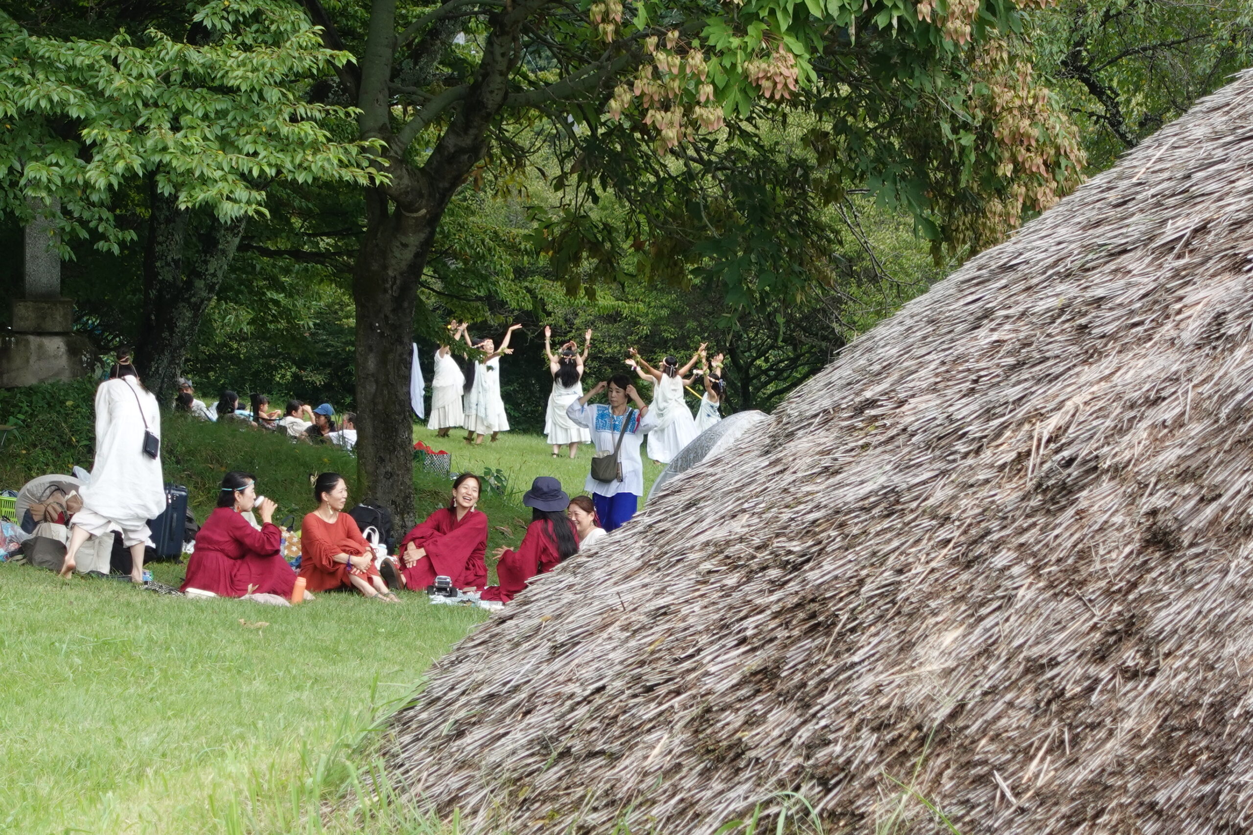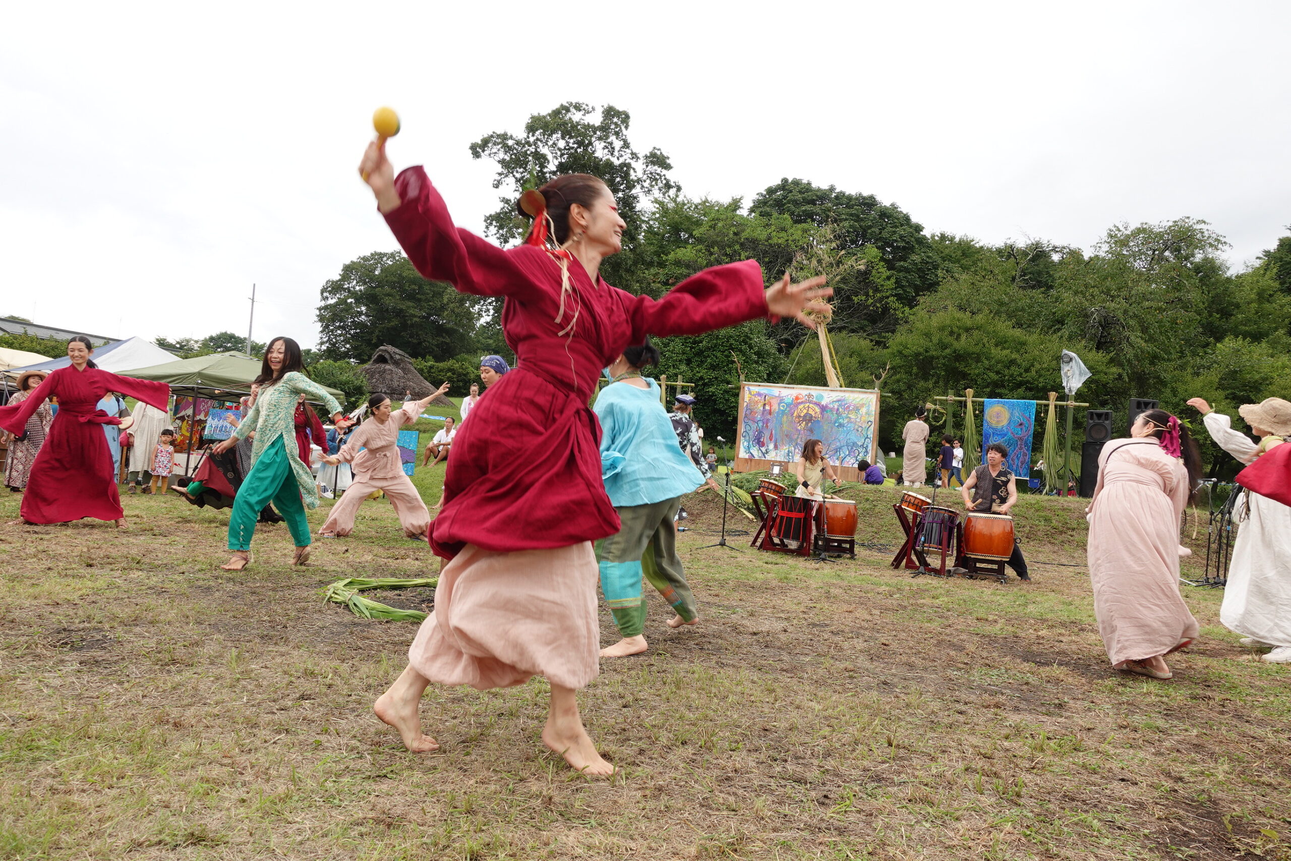石器時代の人が着たはずのない衣装を着て、彼らが演奏したはずのない楽器を演奏しているには違いないが、考古学的正しさは、はじめから問題にしていないのだろう。はじめいかがわしく見えた真っ赤や純白の装束の踊りも、しばらく見るうち、太古を呼び起こす正当な道具立てに思えてきた。どうやらこの人たち、本気で縄文を愛しているのだ!