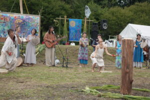 ――そう、ブームには違いない。縄文祭という大イベントが、考古館のすぐ下に拡がる遺跡公園で催され、数百人がやって来た。女性たちは真紅の衣をまとったり、古代ギリシャの巫女を思わせる白い衣をまとったり、花を輪に編んだ冠をかぶったり、ひなびた信濃境が、ヒッピーの聖地になったみたいな、ドキッとさせる祭だ。縄文人の竪穴住居のまわりで、果てしなく踊りつづけるグループもいる。