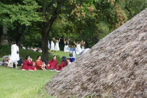 最近のページは稲刈りの仲間の幸せそうな顔たちが満載。さかのぼるとチリ出身のシャーマンの指導で踊ったり、祈ったり、ブドウやナシの収穫、ヨガ、瞑想……。稲作をもたらした弥生文化が縄文を滅ぼしたのだから、共同稲刈りを楽しむなんて、縄文人への裏切りみたいだけれど、小林さんたちの縄文教は、そんな狭苦しい考え方をしない。「祈り」「平和」「いのち」がかれらの縄文のキーワードのようだ。