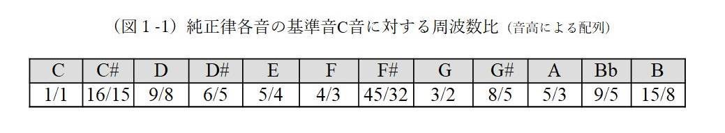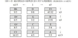 ヤングとライリーが音律構造を決める際の原点となったのは純正律である。これは基音の振動数に対し整数倍の振動数をもつ倍音音程のうち、第3、第5倍音をもとにオクターブ内の12音の音律を体系化したものである(図1-1)。特にライリーの《ハープ・オブ・ニュー・アルビオン》にはこれに近い音律が使われている。