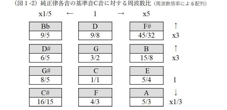 図1では、基音Cを中心に、縦軸を上にたどると周波数は3倍、下方向は1/3倍、右方向は5倍、左方向は1/5倍となる。例えば、基音Cから上方向の第3倍音をG音、右方向第5倍音をE音とするのだが、倍音のままでは基音とそれぞれ1~2オクターブも離れてしまい、1オクターブ内で完結させる「音階」の範囲から外れてしまう。このため、前述の通り分数値の分母または分子に2またはその乗数をかけることで、周波数比の値1~2以内、つまり1オクターブに収まるよう操作している。ヤングやライリーの音律も、この手順で各音の音高を決定している。