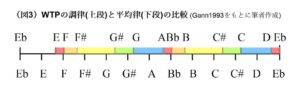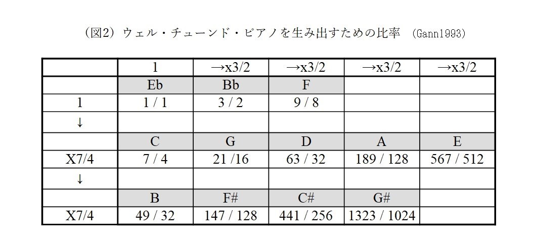ガンの分析(1993)(5)を要約すると、WTPの音階では、まず基音(Eb音)に対して周波数比3/2(第3倍音の1オクターブ下=純正五度)のBb音、また音階上では六度上にあたり基音と周波数比7/4(第7倍音の2オクターブ下=純正七度)となるC音の3つの音が柱となる(図2)。さらにBb音、C音の周波数を3/2倍(純正五度=図2の縦軸)または7/4倍(純正七度=図2の横軸)した音から12の音を導く。