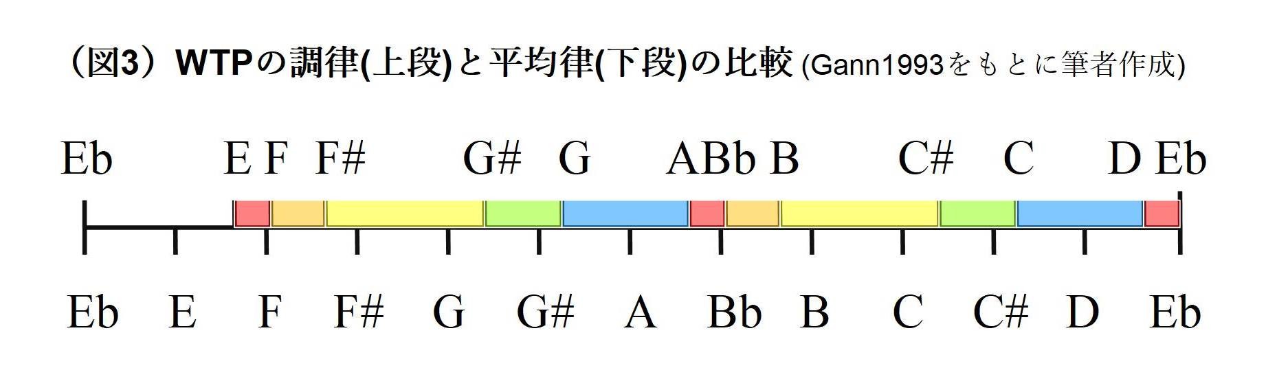 この音律のもうひとつの特徴は、音階のうち2カ所で音高が逆転していることである(図3、Gann1993の図に筆者が着色)。