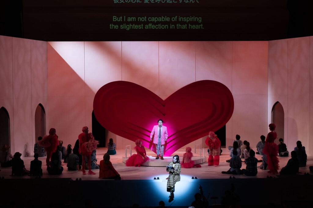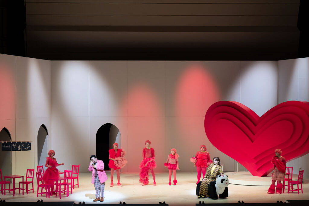 演出の杉原邦生が掲げたキーワードは「かわいい」。この一語で舞台を統一する。白を基調とした反響版?で囲まれた舞台中央には、巨大なハートのオブジェがある。この舞台装置の色は、どぎついピンク。回転させると裏面は黒になっていて、役の心理状態や場面の状況で変化する。