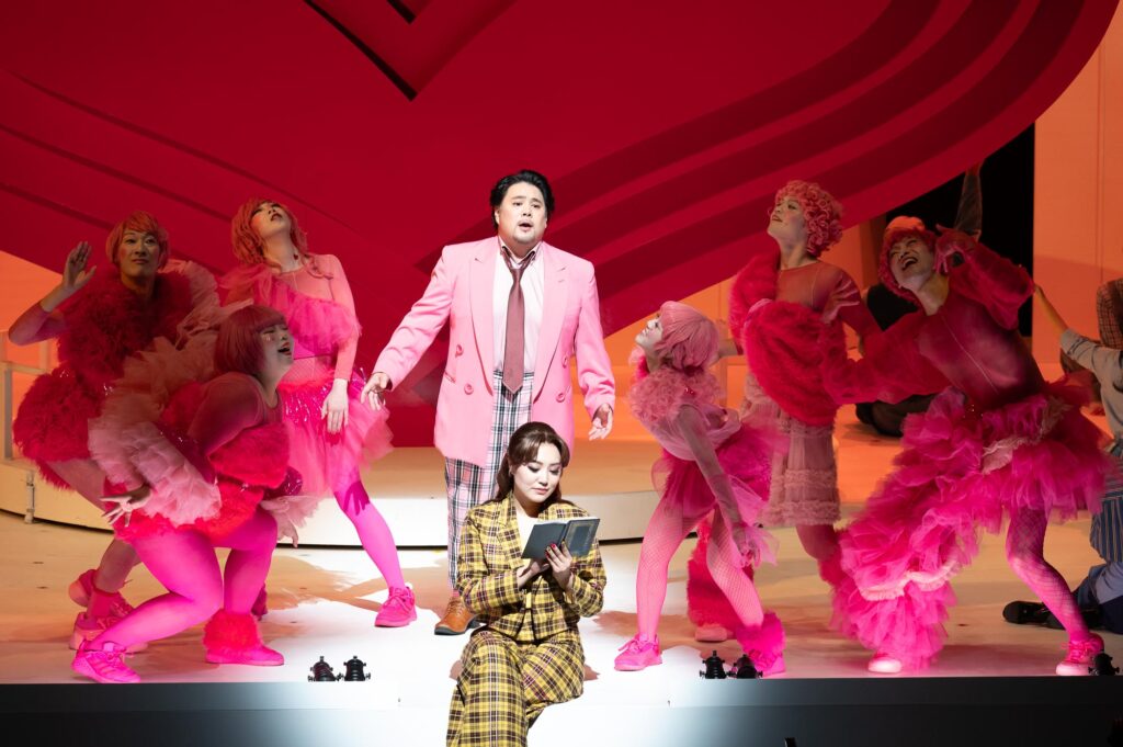 舞台上に終始居合わせるダンサーたちは、それぞれにデザインの異なる、ピンクの衣装をまとっている。出来事を見守り、時には衣装を変えて場面の説明や補足を担う。彼(彼女)らにはジェンダーレスな要素も加えられており、直線的な男女の恋物語の中に、現代的な視点も打ち出しされている。