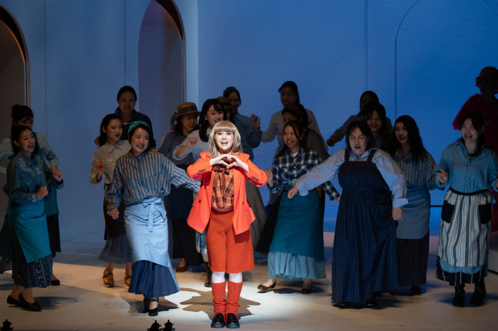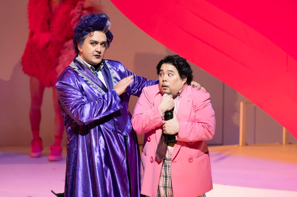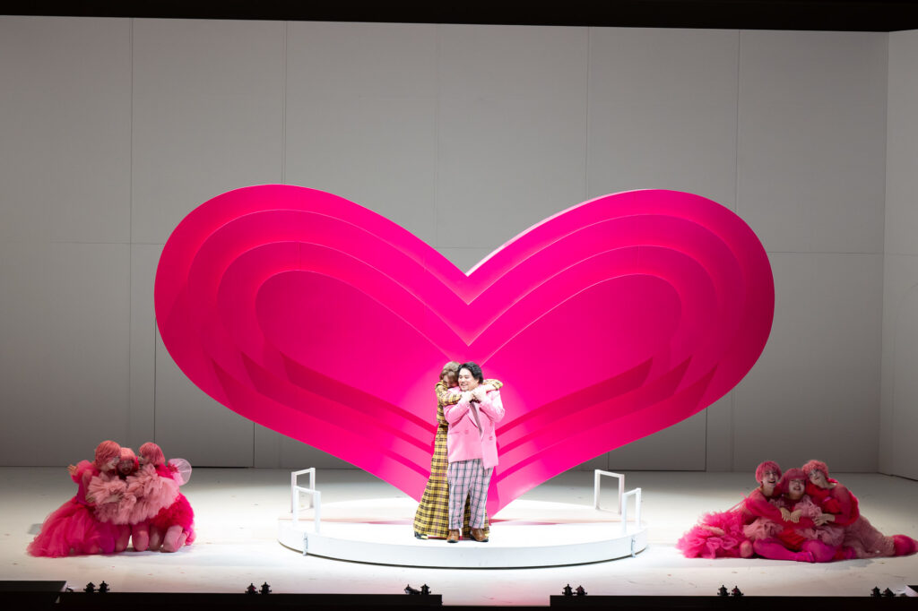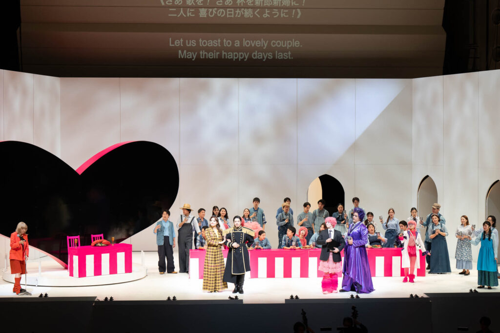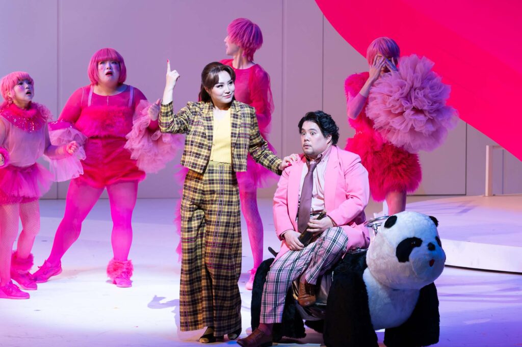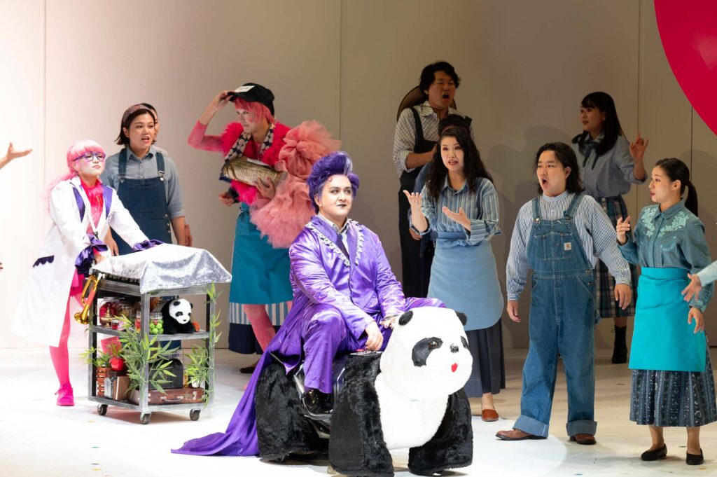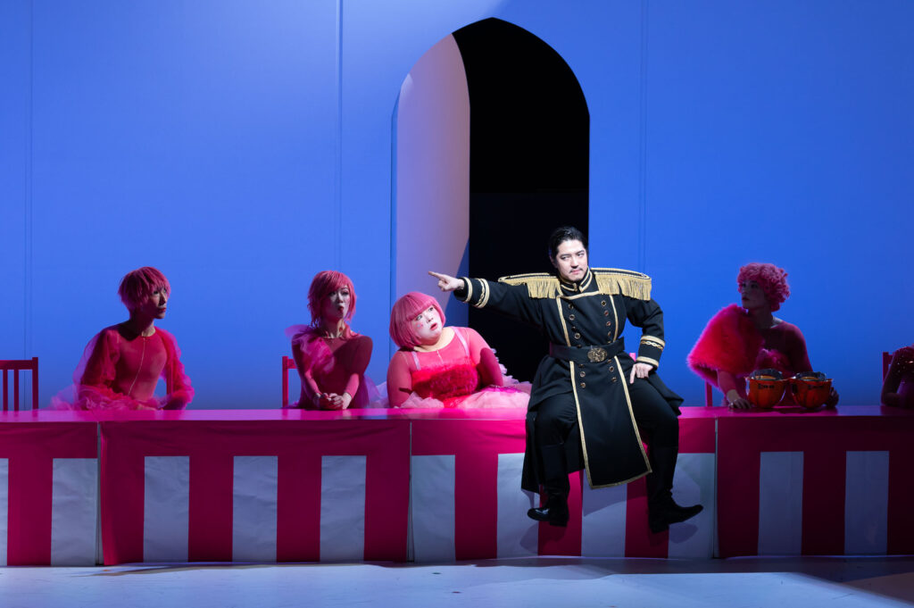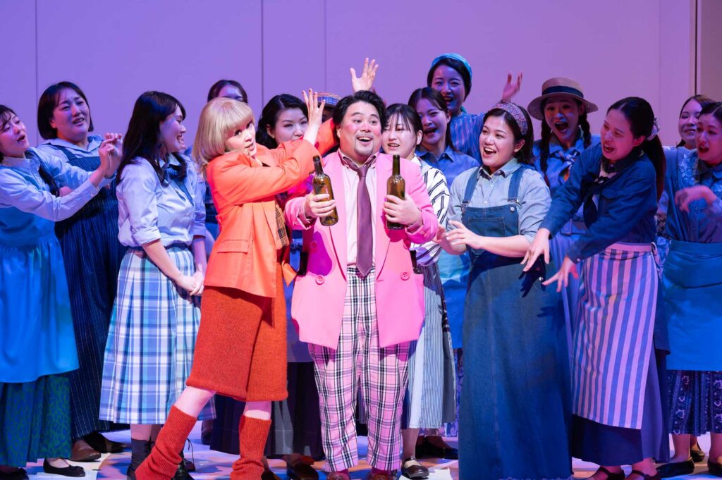 個々のキャストは大変充実している。ネモリーノの宮里直樹は、不器用さゆえの一直線な恋心をまっすぐに体現。知的でいたずら心もある高野百合絵のアディーナ。チェックのパンツスーツという現代風のいでたちもよく似合っていた。ベルコーレの大西宇宙は、重厚な軍服姿。横柄さの中に見える少しだけの人の良さが、今回の「かわいい」世界観に妙にはまる。ドゥルカマーラのセルジオ・ヴィターレは、パープルに光るローブと盛り髪で、イカサマ師っぷりを存分に発揮。ジャンネッタの秋本悠希は、ソリスト陣と合唱の橋渡しのような役割を、要所要所で果たす。合唱の村人たちはブルー系の衣装と、色彩選びもセンス良くまとめられていた。