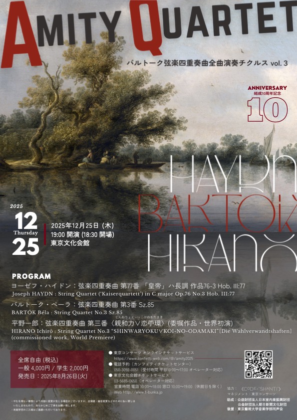 平野作品がそういう作りであったのはもちろんだが、間違いなく、アミティの演奏がなければここまでの壮大無双世界は現出しなかったろう。その意味で、まずはこのカルテットを称賛したい。前半2曲、宮廷楽師ハイドンの皇帝讃歌に潜むちょっとした逸脱、民族性の一方で尖鋭な暗渠を抱えたバルトークの音が鳴ってこそ、平野の響きが活きた、その知見も含め。