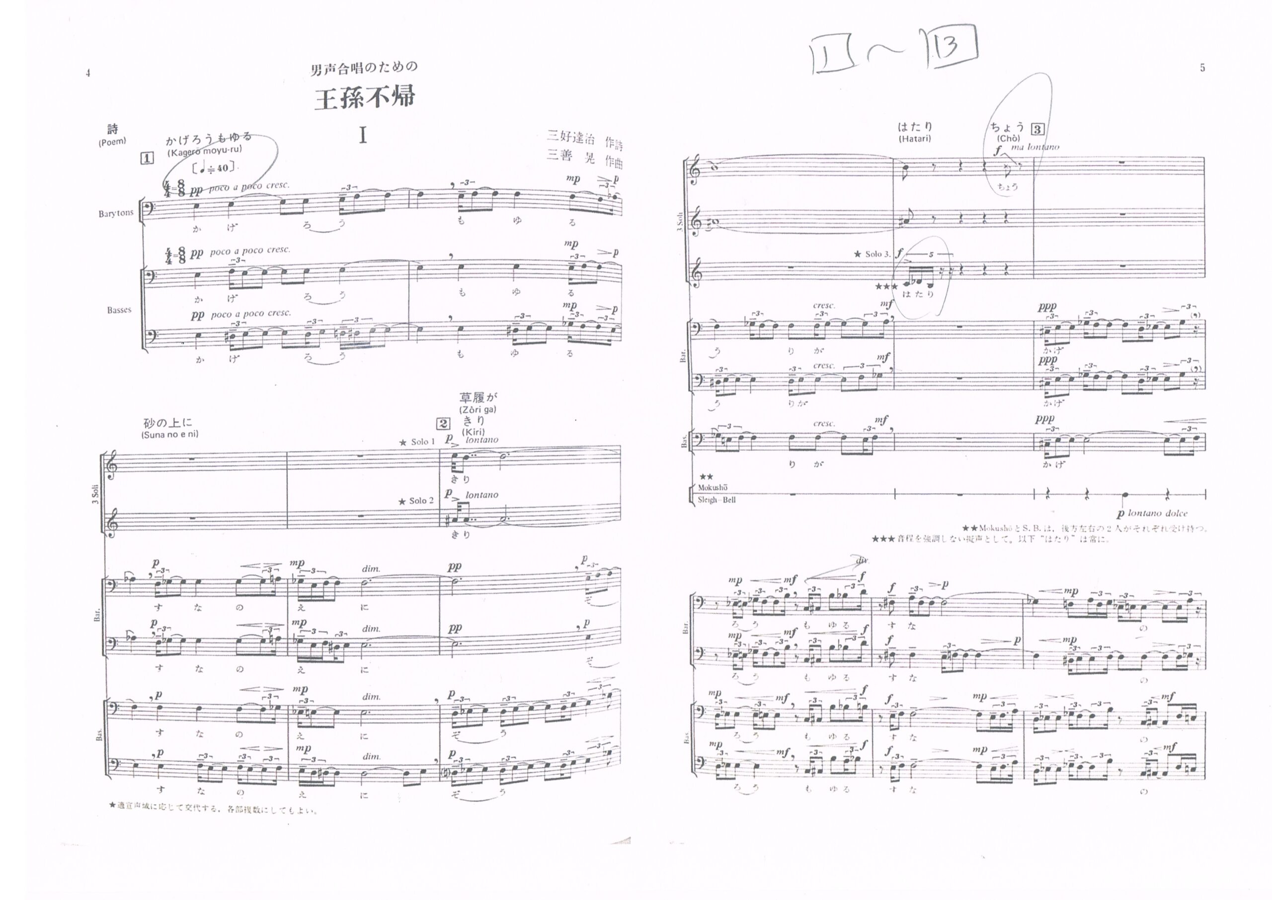 テキストは三好達治の古語詩で、原詩は『楚辞』(前漢末期成立)収録の「巻第十二《招隠士》」(淮南小山作)の一節「王孫遊兮不歸 春草生兮萋萋」を引用したもの。内容は『楚辞』の大詩人屈原(紀元前340~ 278年)への愛惜とされるが、屈原は主君に異を唱えて国を追われその悲憤憂国から汨羅江に投身死した悲劇の人。ちなみに西村朗の合唱第1作『汨羅の淵より』(1978/無伴奏混声合唱)も同じく『楚辞』の屈原《懐沙》から入水の様を歌ったもので、そこに彼は「滅びの美」を見ている。彼が三善の『王孫不帰』を知っていたかどうかは不明だが、初演は8年後で指揮は同じ田中信昭。西村のそれは全編異様叫声に読経もどき、漢詩そのままの朗唱ゆえ意味不明だが、三善の本作も古語詩であることから、それに近い。言葉(詩)は聴き取れなくて良い、という『レクイエム』の姿勢はすでにここに明らかだ。手元にテキストがなければまず意味はとらえられず、合間に入る「きり」「はたり」「ちょう」といった句ばかりが耳に残ろう。だが全体の切迫感には圧倒される。