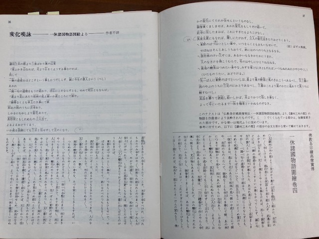 三善はこのあと、邦楽器を用いての『変化嘆詠』(1975/混声合唱、尺八、十七絃、鼓と打楽器のための)を書く。テキストは『仏教各宗高僧続高僧実伝・一休諸国物語図絵巻四』からで、一休禅師(宗純)の諸国旅でのエピソードを挿絵入りで描いたもの。