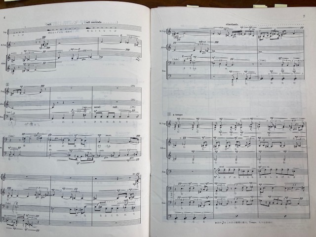 ここでの邦楽器については、1972年に『トルスⅣ』として弦楽四重奏と邦楽四重奏(尺八、箏、十七絃)ですでに経験、心得た扱いと言えよう。編成は文化庁からの委嘱として決められたものではあるが、同時期に『レクイエム』が世に出されたこと、母の死を経ての「慈悲」の感覚が1974年『チェロ協奏曲』(母なる海)に見出されることを思えば、三善の中の「日本」が少しずつ形をとってゆく過程を示していよう。