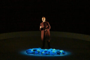 「誰も死を知らない」と語る勅使川原が冥界を描く手法はきわめて創発的なものだ。美術は奥行きをあまり使わず、2Dに近い景色。そこに対角線を引くと、明かりのなかで演じられている空間はいつも1/4に過ぎないことがわかる。残り3/4は真っ暗、その闇のなかで合唱やバンダが演じている。