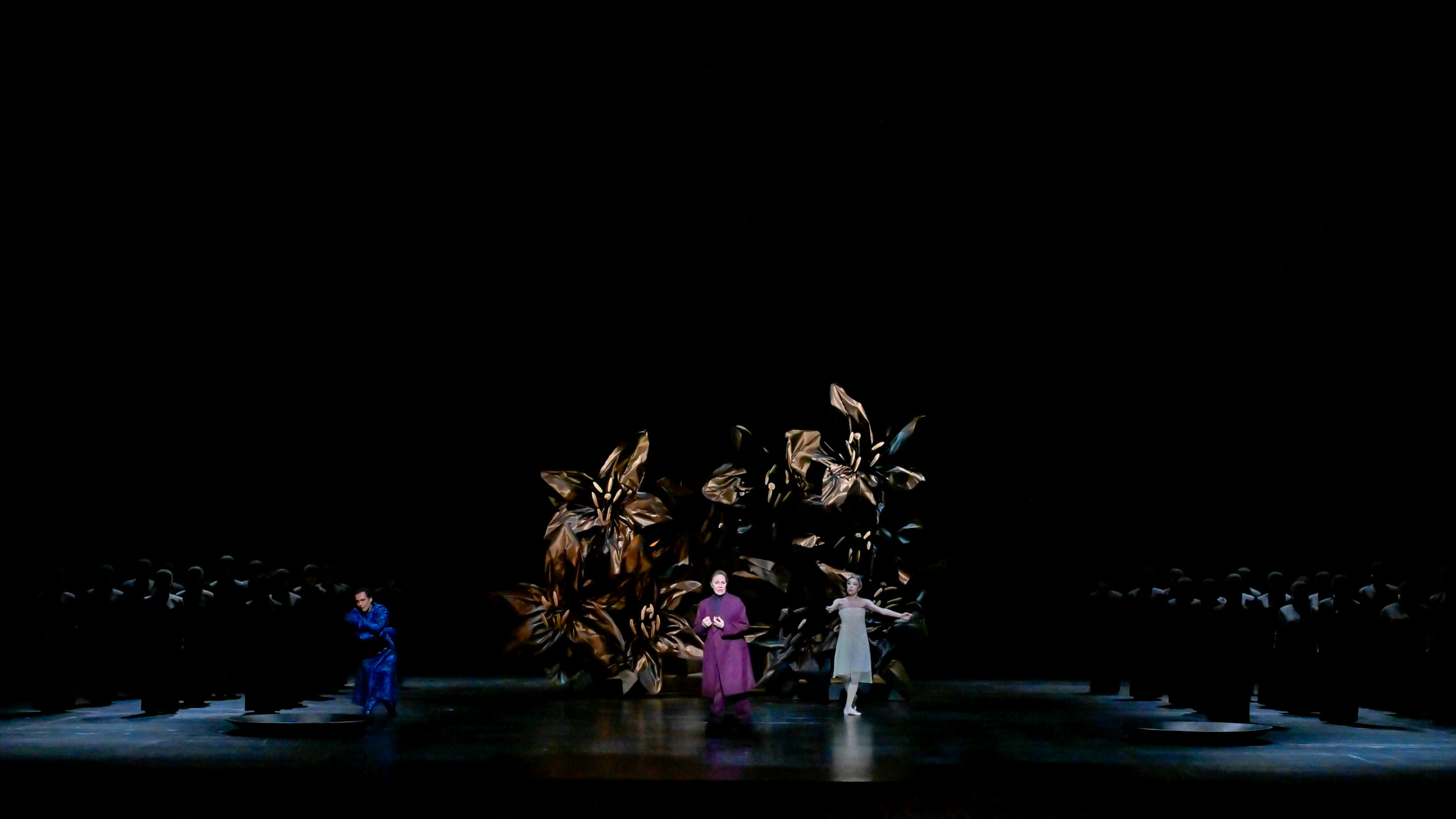 第2幕では合唱とオーケストラが出色の活躍を見せた。本作はキャスト全員が女声であり、全体に軽く細い、線形の音が続く(オルフェオはカウンターテナー、アモーレはソプラノが演じる場合もあるが、いずれにしても高音域に偏っている)。そこに音のマッスで重量感を与える混声合唱は上演全体の成否を握る。新国立劇場合唱団(合唱指揮:冨平恭平)は整ったアンサンブルで高い一体感をもつ。ギリシャ劇のコロスという「ひとつの大きな仮人格」の伝統をふまえて雄弁に語った。精霊の嘆き、神々の怒りと脅し、慰め、そして人々の祝祭といった多くの役割を演じわける。オーケストラは、トロンボーンとホルンが作る重金属の威圧感、そして、ニュアンスをたっぷり湛え、表情をゆたかに変えるオーボエを特筆したい。