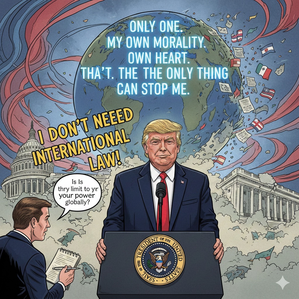 「わたしには国際法なんていらない。」と豪語するトランプ大統領、『ニューヨーク・タイムズ』の記者に「世界で権力を行使するうえで、ここまでという限度がありますか?」と質問されると、「一つある。私自身の道徳。私自身の心だ。それが私を止められる唯一のものだ」と宣言した。