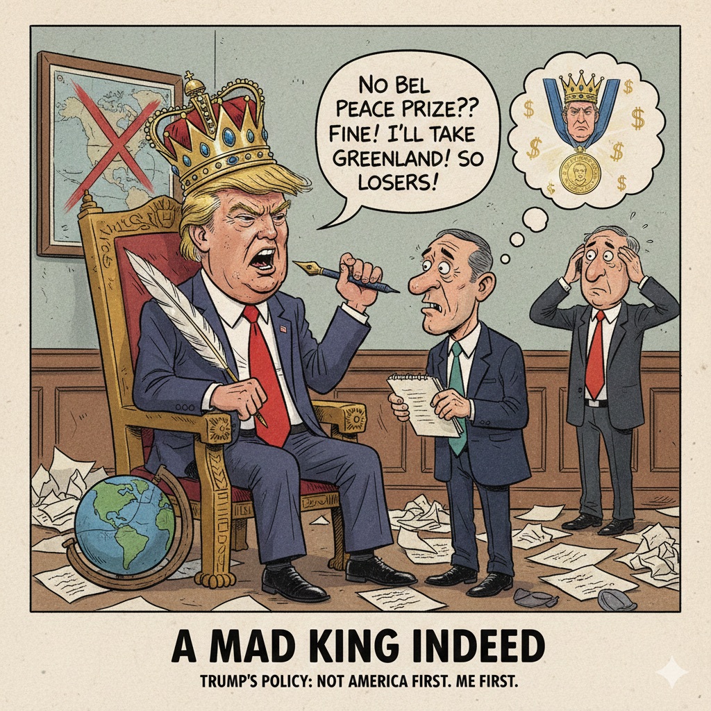 トランプがノルウェー首相にあてて、ノーベル平和賞をくれないから、グリーンランドを手に入れようとがんばっているのだ、と赤ん坊がだだをこねるみたいな文句を書き連ねたのを読んで、フリードマンも「いよいよおかしい」と確信したのだろう。
