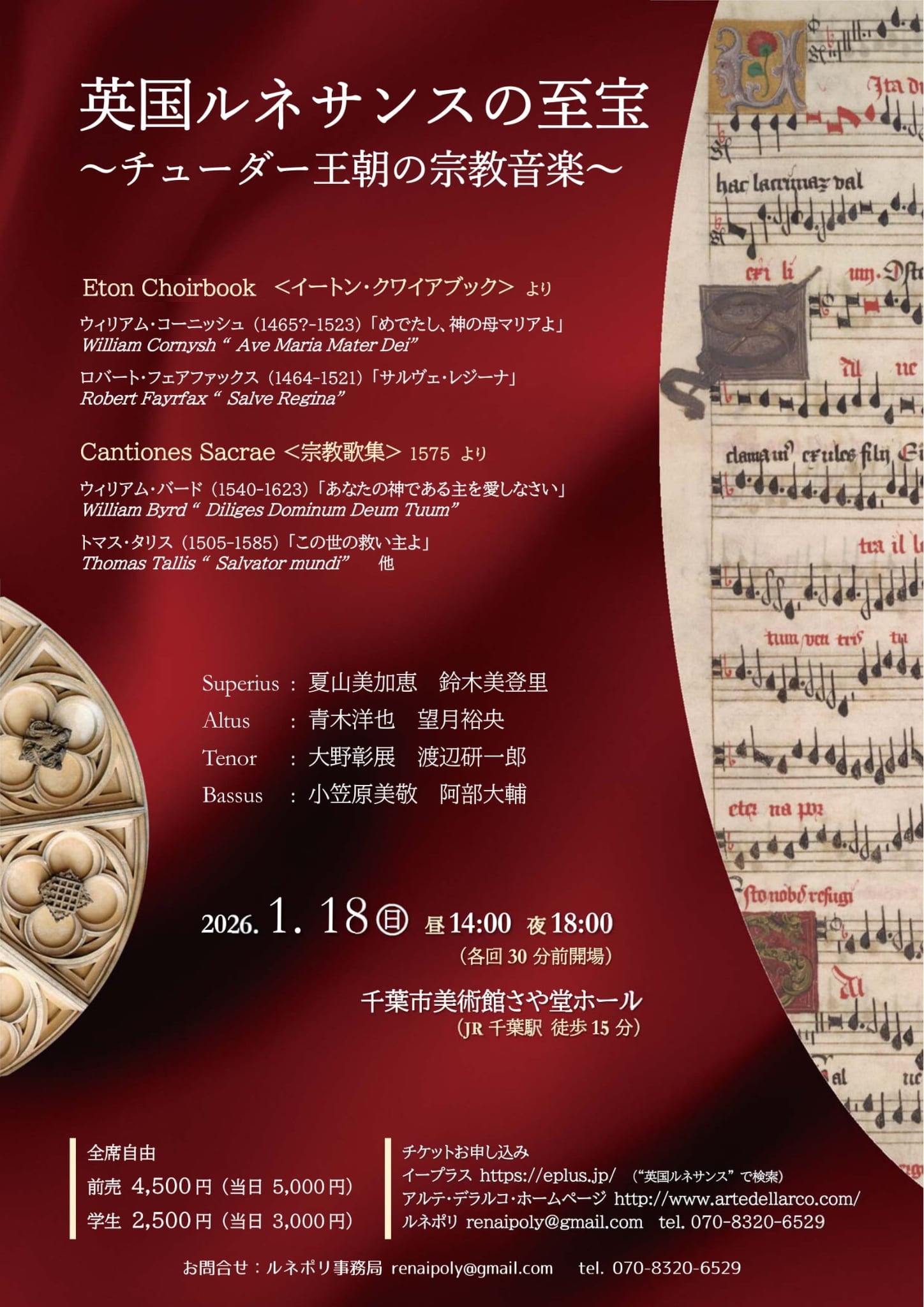 プログラムは1500年頃にイートン校のためにつくられた『イートン・クワイヤブック』と1575年に出版された『カンツィオネス・サクレ』を大きな柱としている。両曲集は50年ほどの年代差があり、宗教改革の前と後という時代の違いもあって、英国ルネサンスの音楽が一枚岩ではないことを物語る。
