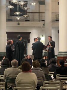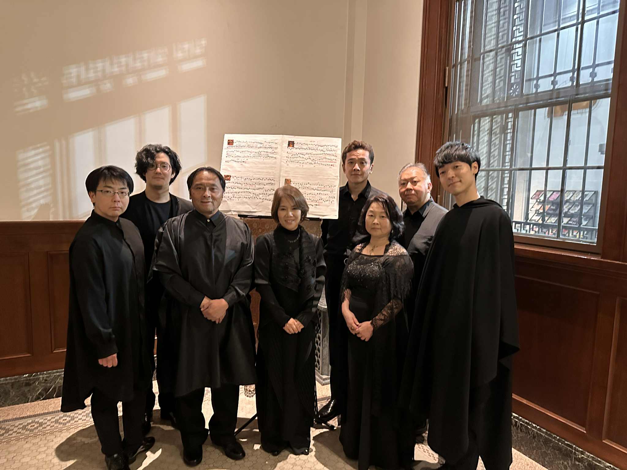 今回の8人のメンバーは、1つのグループから成るのではなく、普段はそれぞれ別のアンサンブルで活動しており(鈴木と小笠原が「ラ・フォンテ・ヴェルデ」のメンバーであることだけは例外)、個々に共演経験はあるだろうが、このメンバーで揃うのは初めてなのではないか。若手からベテランまで年代もさまざまである。にもかかわらず、長年一緒に音楽をやってきた仲間のようなアンサンブルのよさであった。クワイヤブックでない4曲目からは、それぞれが自分のパート譜を持って、中心で内向きの円の形で歌われたことで、彼らの声が円の真ん中で溶け合って、天井から降ってくるように感じた。