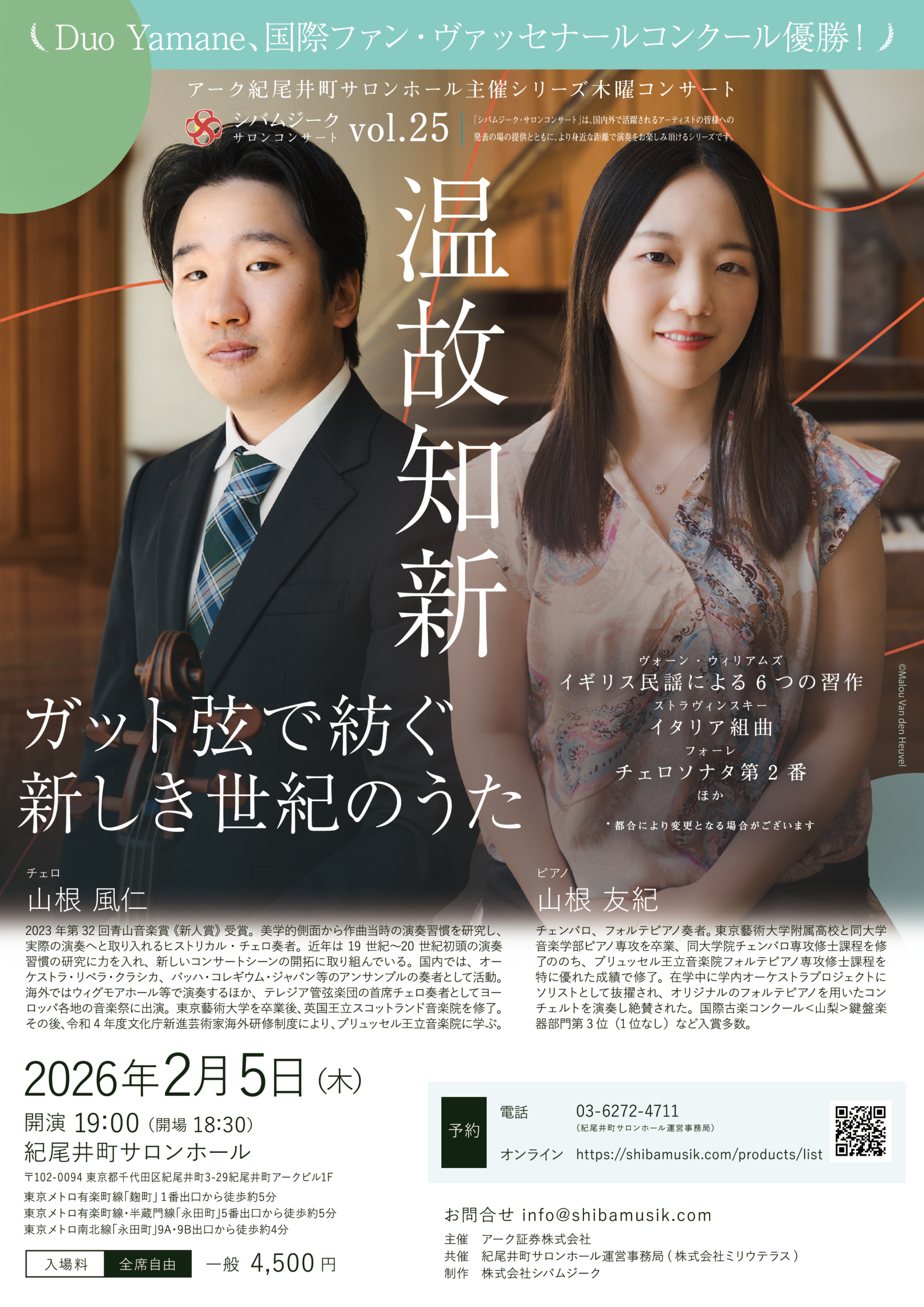 シバムジークサロンコンサートは、紀尾井町サロンホールで月1回開催されているシリーズである。普段は古楽器(バロック・チェロとフォルテ・ピアノ)で古典派、ロマン派時代の作品を演奏することの多いDuo Yamaneが、ガット弦を張ったチェロとモダンのピアノで臨むコンサートを聴いた。
