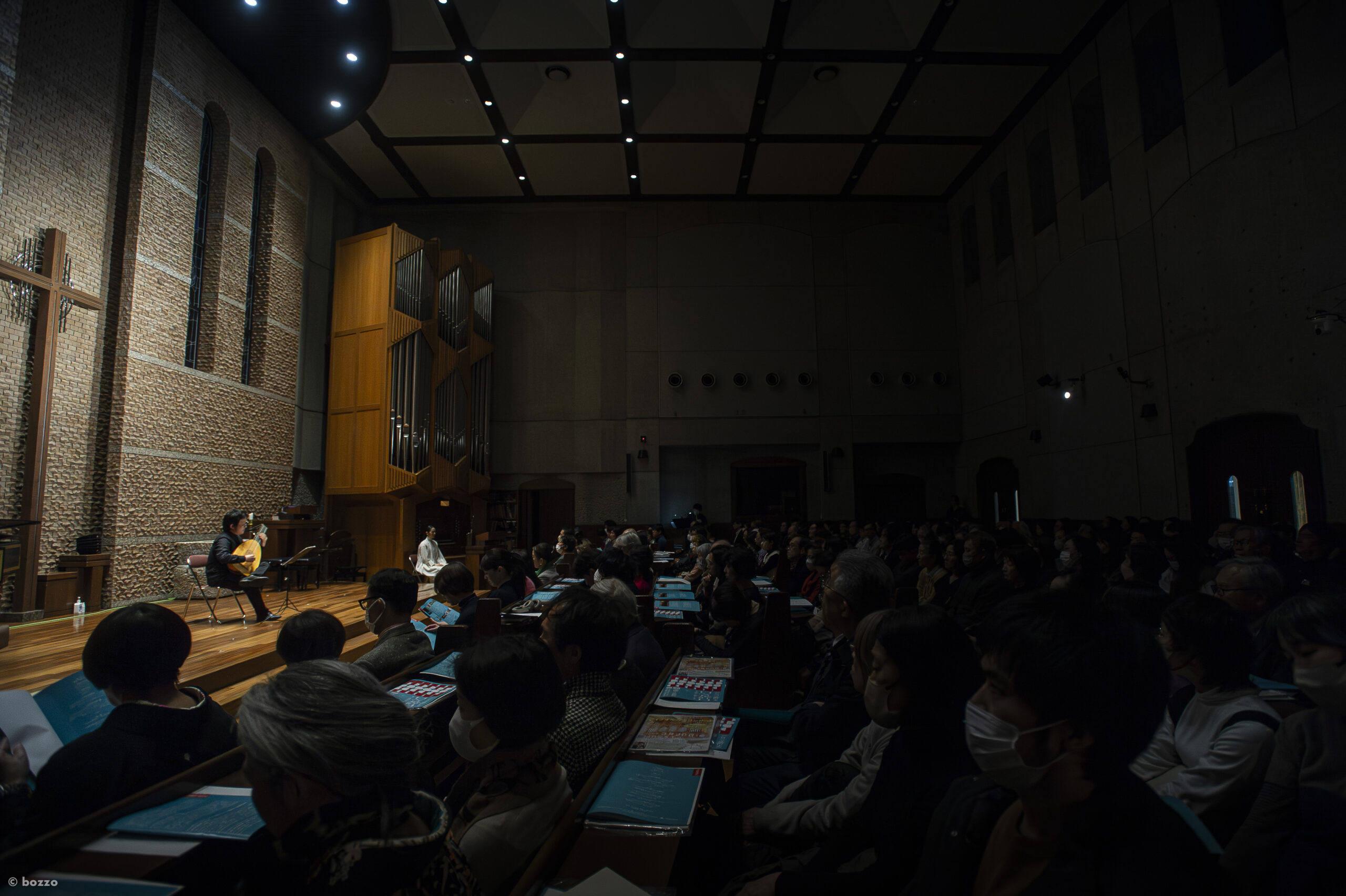 ここらで、私の耳は朗読をスルー(聴き取ろうとしない)、舞台転換のつなぎとし、古楽器と邦楽器の綾なす木漏れ日へと穏やかにいざなわれる。最初はそれぞれの楽器の異なり(様々な意味で)へと意識がいったが、そのうちどうでも良くなった。リコーダーと篠笛の空間対置そのほか、音の相違の認識に何の意味があろうか。こちらもジグザグ進行で、立ち昇り行き交い響き合う多様な音の流れ、時折鳥の囀りなんかが聴こえたりし、その頭上に、十字(架)を囲む柔らかなゴールドの灯りが点っているのを感じる。いい…。