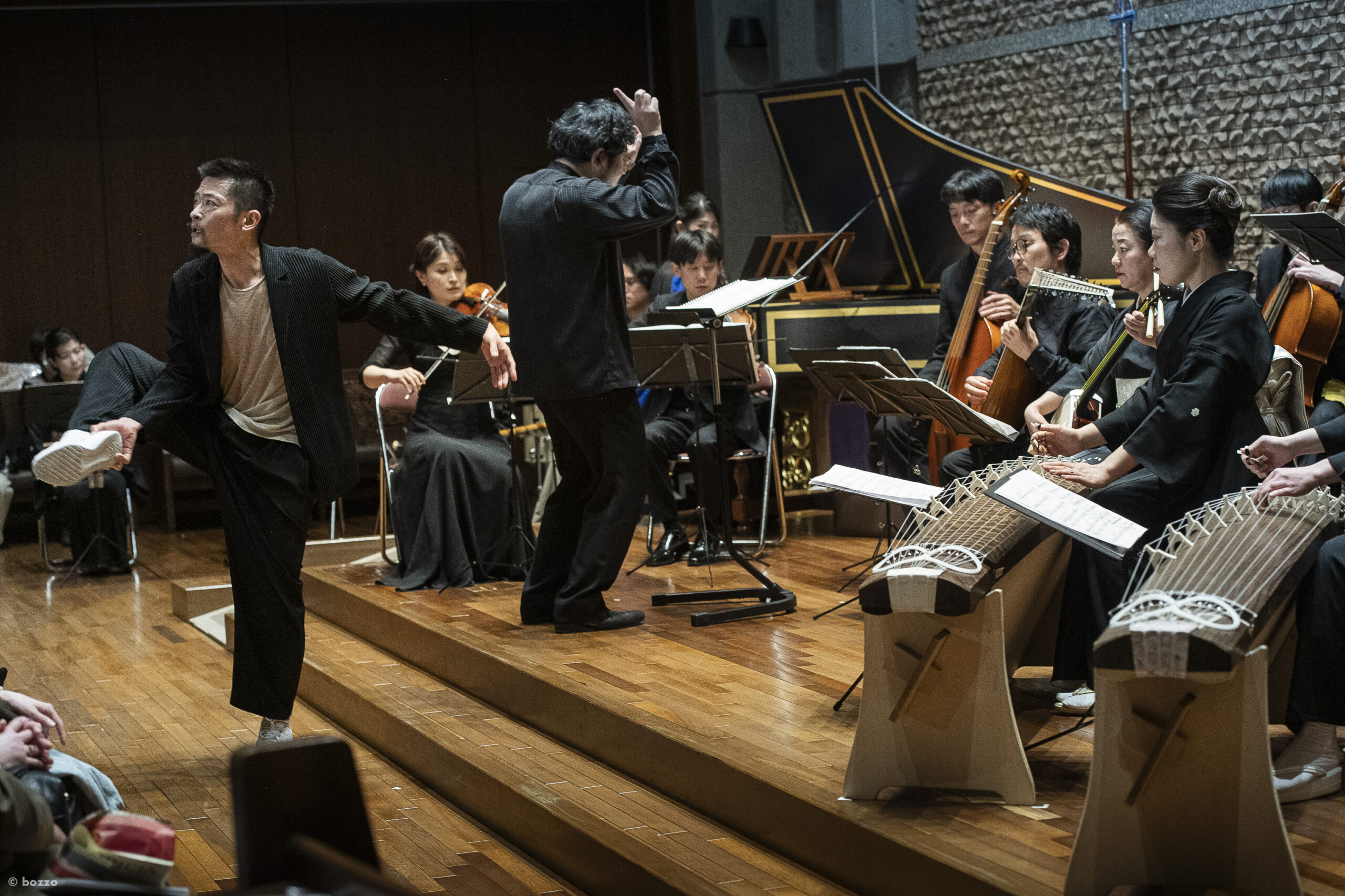 一方、ワーグナーのケルト伝説『トリスタンとイゾルデ』とグルックのギリシア神話『オルフェオとエウリディーチェ』は、カウンターテナーとソプラノの声がやはり西欧劇そのもの。ダンスもいかにもコンテンポラリーだが、ステージ中央、ほとんど音の化身と見える鷹羽の指揮の身体運動美に見惚れ、私には目の隅をかすめる程度。が、両サイドの客はダンサーを追って斜座りするからちゃんと全体像の一部となっているのだと思う。