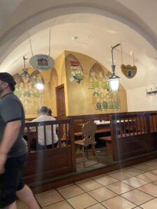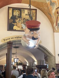 このバイエルン訛りで繰り広げられるアロイジウスの話し方や振る舞いを、観客の大人たちは大笑いして楽しんでいる。それだけでなく客席から人形に話しかけようとする人もいた。もう、ただの人形ではなく旧知の知り合いといったところか。ちなみに彼が(現在も)飲んでいるビアホールはホーフブロイハウスと言って、ミュンヘンの市庁舎に近い16世紀からあるビールの醸造所である。今でも年中多くの観光客で賑わっているが、その建物の中に空中を飛んでいるかのように飾られている巨大な人形が、このアロイジウスである。また、壁にも手紙を持って訪れる彼の姿が描かれている。